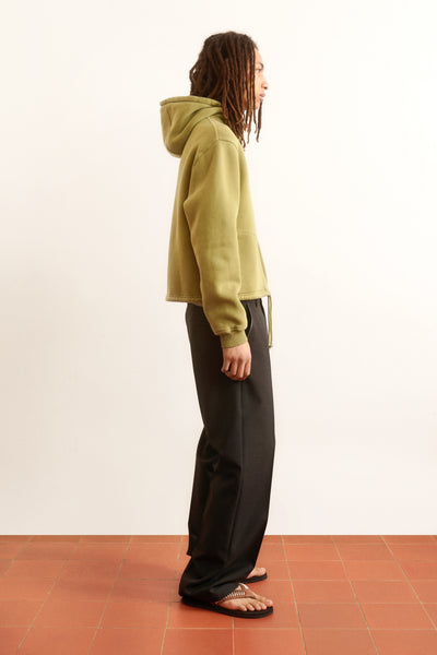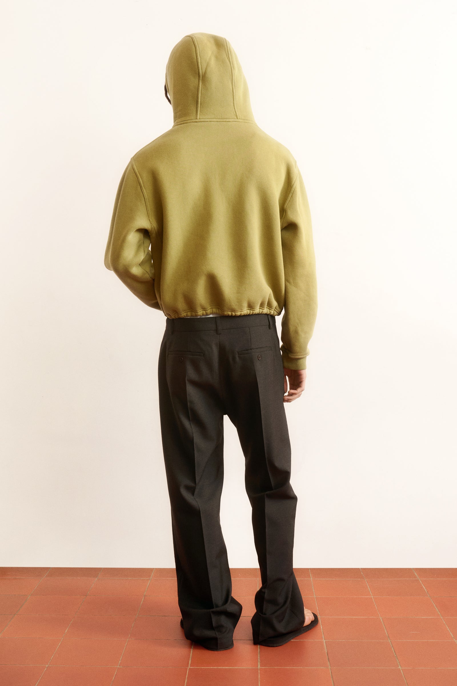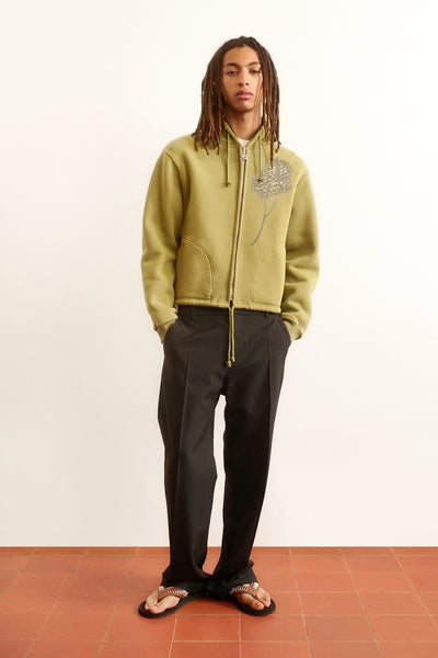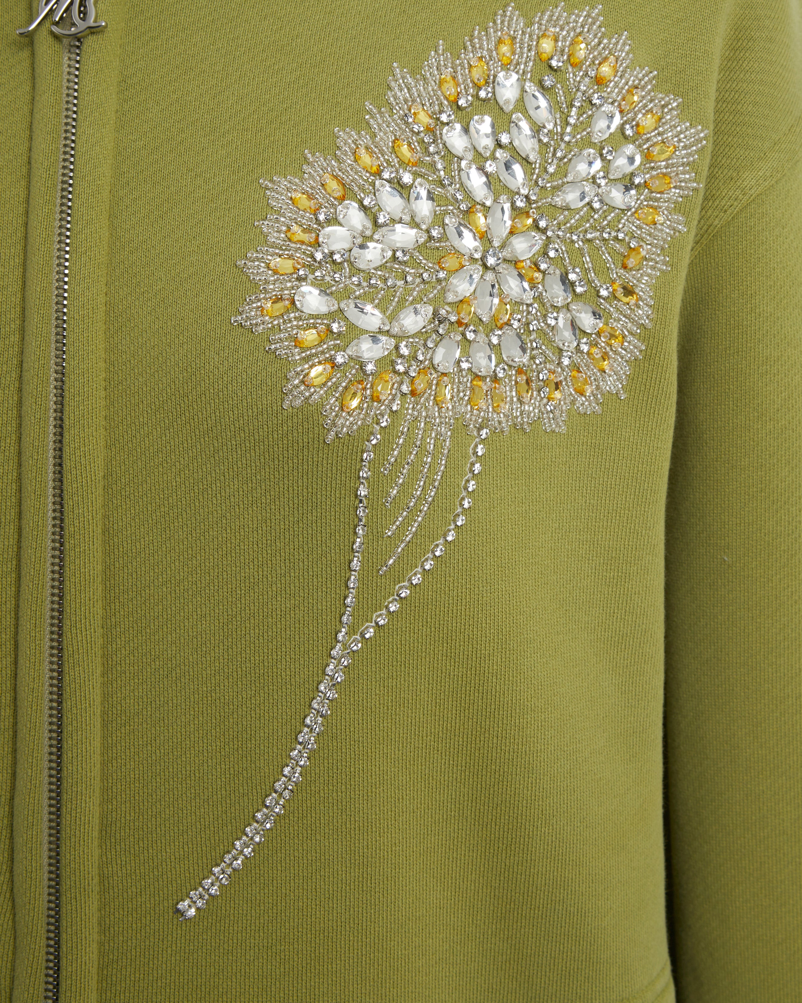 Boxy zip-up fleece hoodie with drawstring hood, front zip with Bluemarble signature puller. Hand-embroidered floral embellishment with rhinestones and beads in various sizes and colors, and two kangaroo pockets.