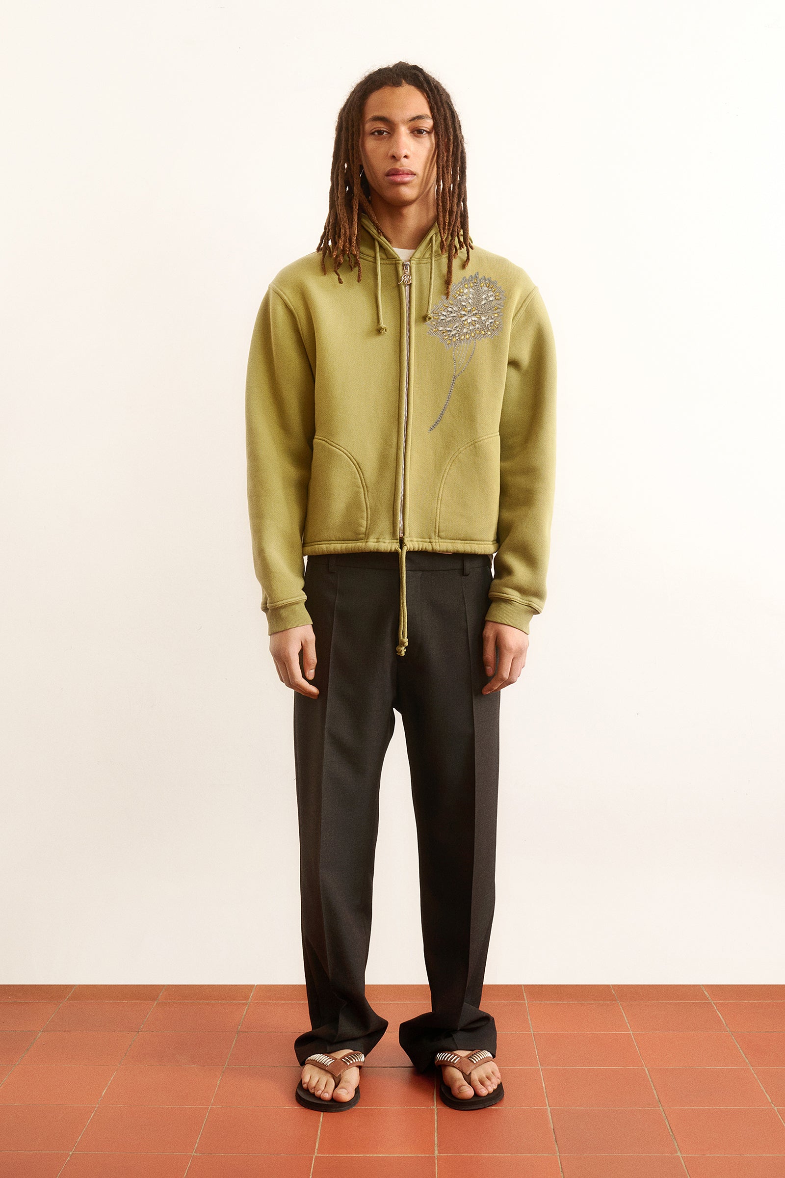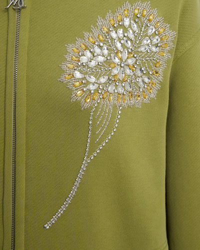 Crystal-Embroidered Zip-Up Hoodie Boxy zip-up fleece hoodie with drawstring hood, front zip with Bluemarble signature puller. Hand-embroidered floral embellishment with rhinestones and beads in various sizes and colors, and two kangaroo pockets.