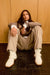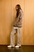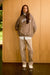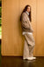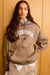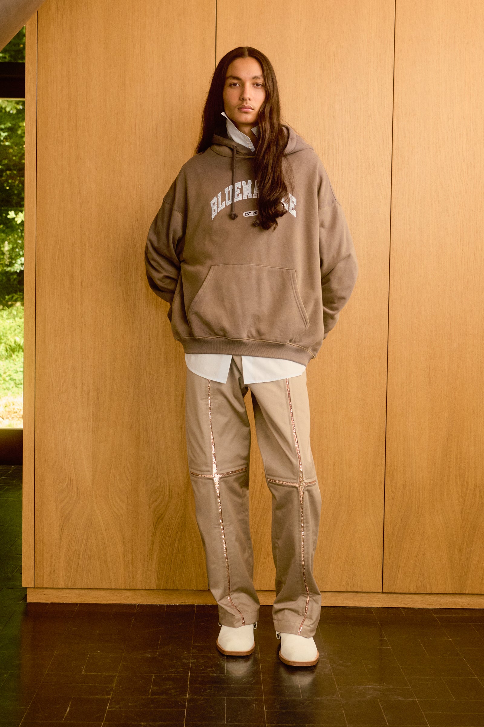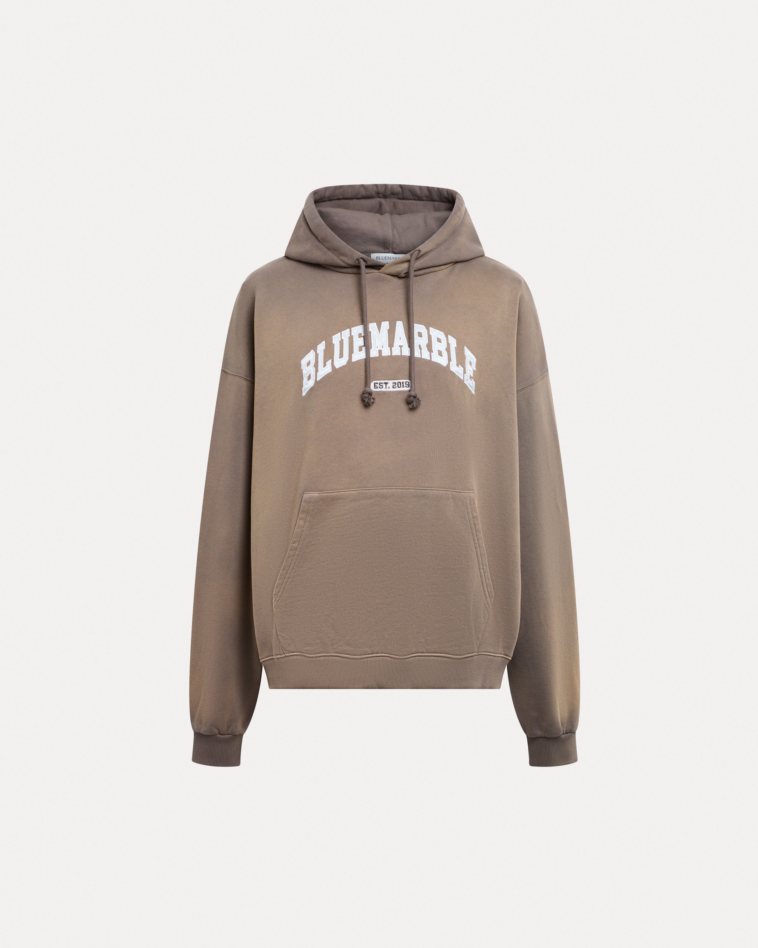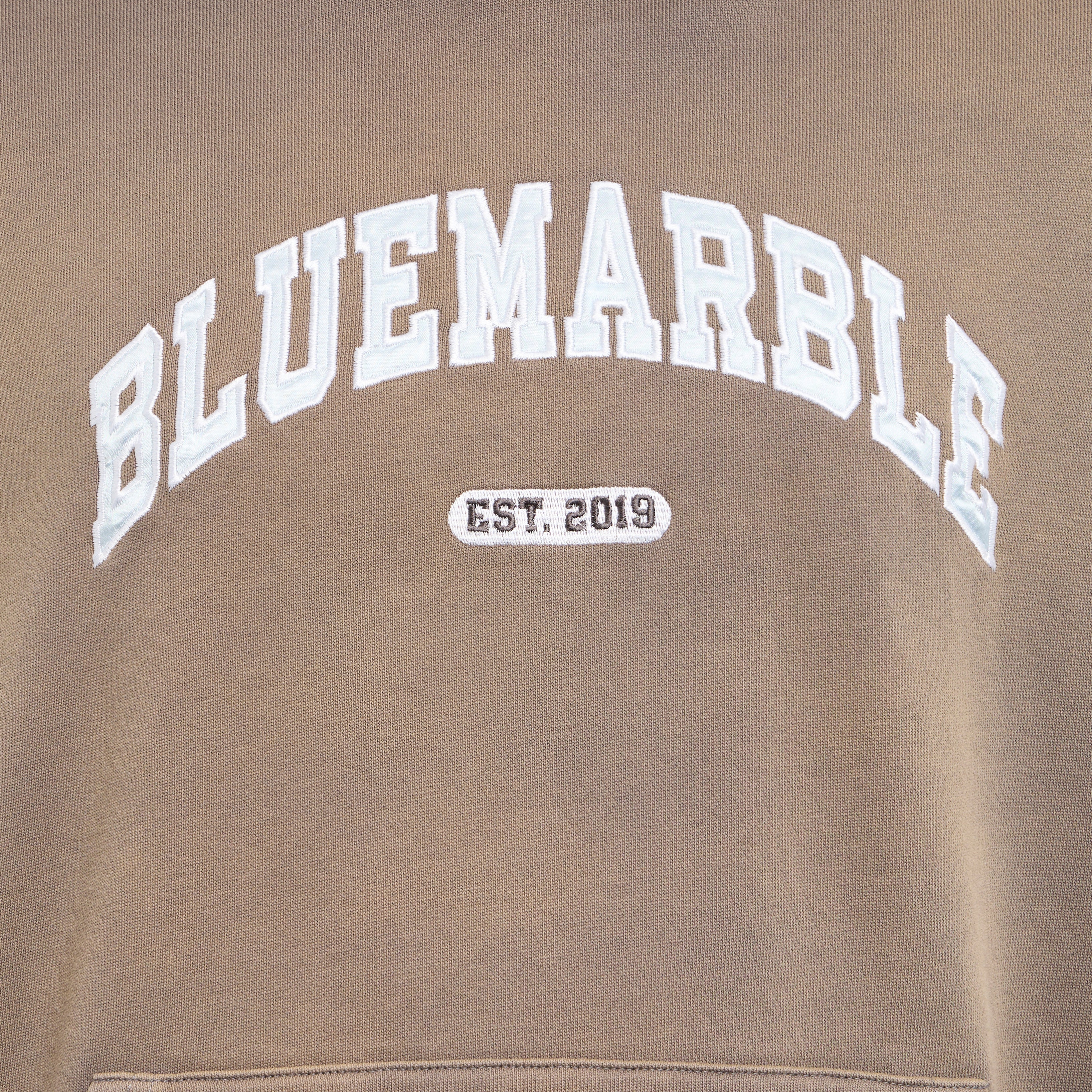 Sweat à capuche coupe carrée style universitaire, couleur kaki délavé, avec inscription brodée « Bluemarble » et poche kangourou.