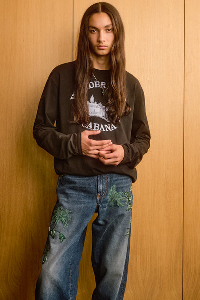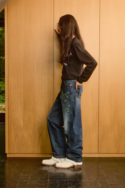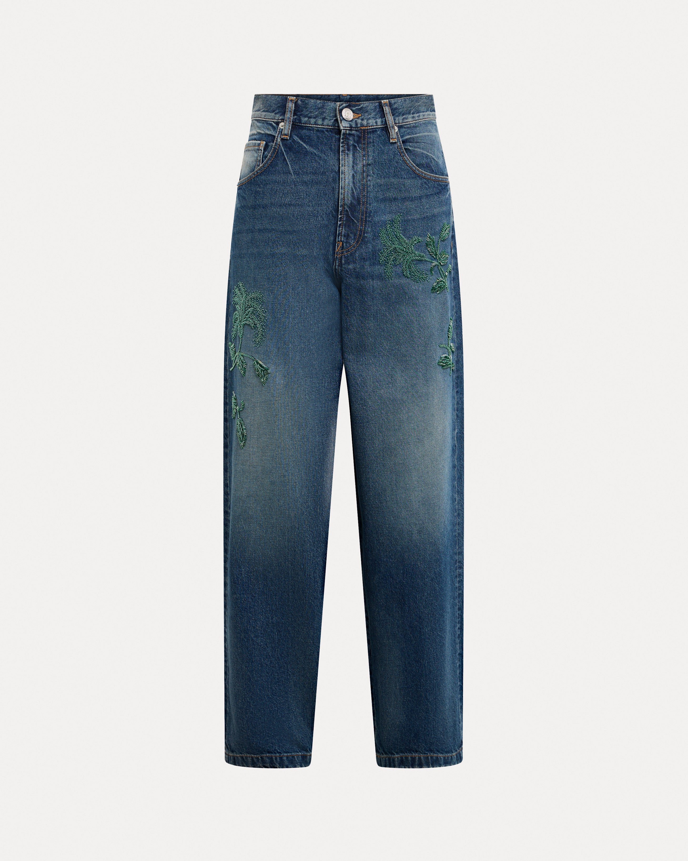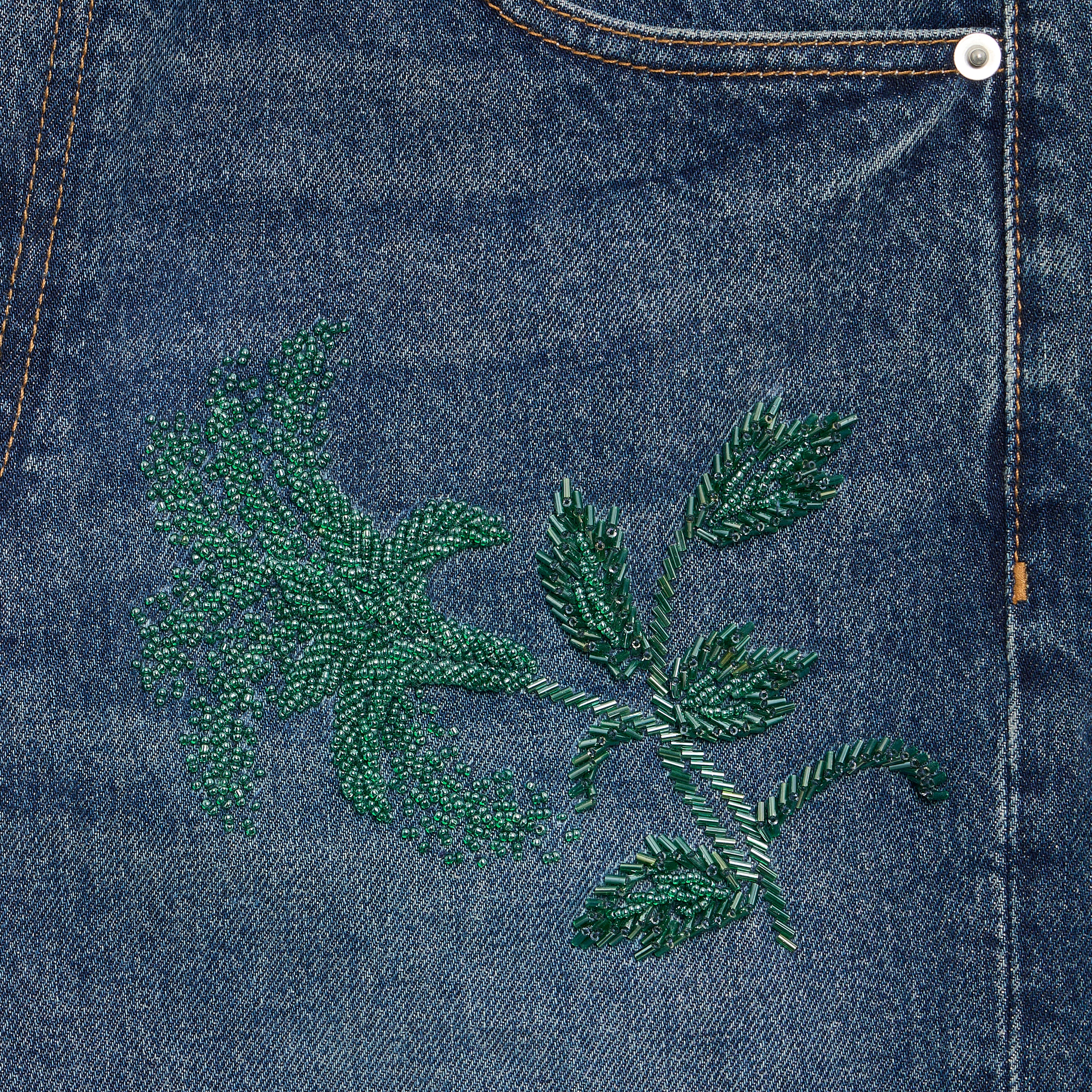 Jean en denim délavé à la pierre, coupe décontractée. Il est doté de cinq poches classiques, d'une fermeture boutonnée et de motifs botaniques complexes brodés à la main avec des perles vertes mélangées le long des jambes.