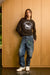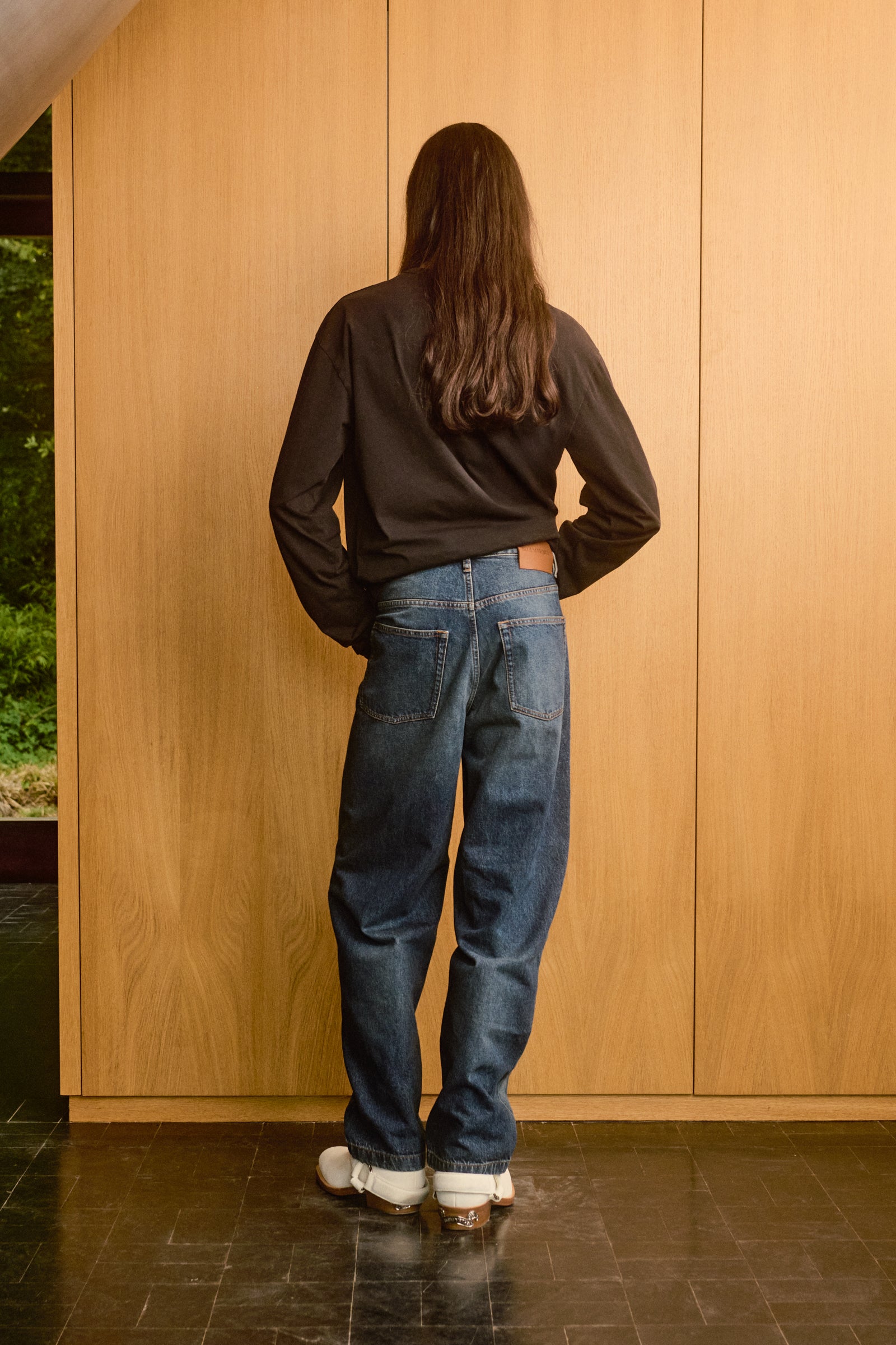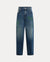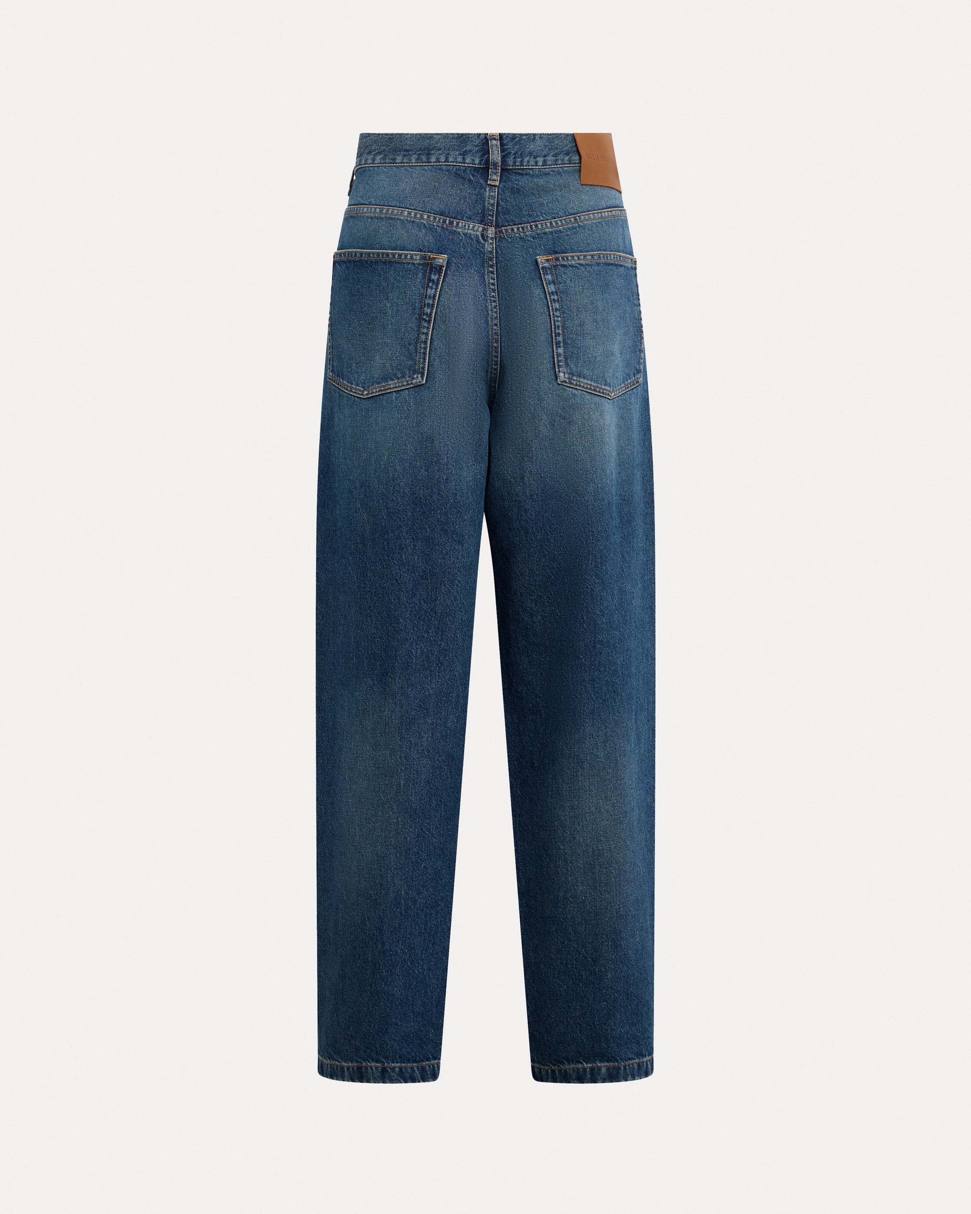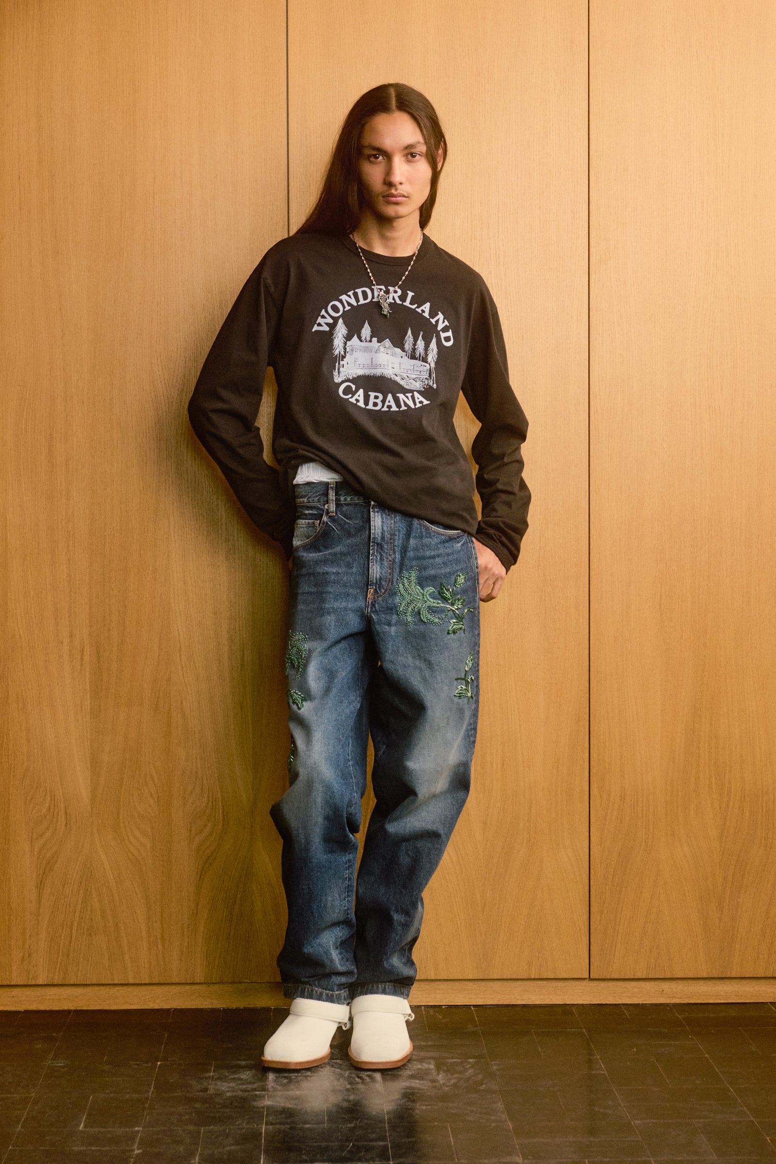 Jean en denim délavé à la pierre, coupe décontractée. Il est doté de cinq poches classiques, d'une fermeture boutonnée et de motifs botaniques complexes brodés à la main avec des perles vertes mélangées le long des jambes.