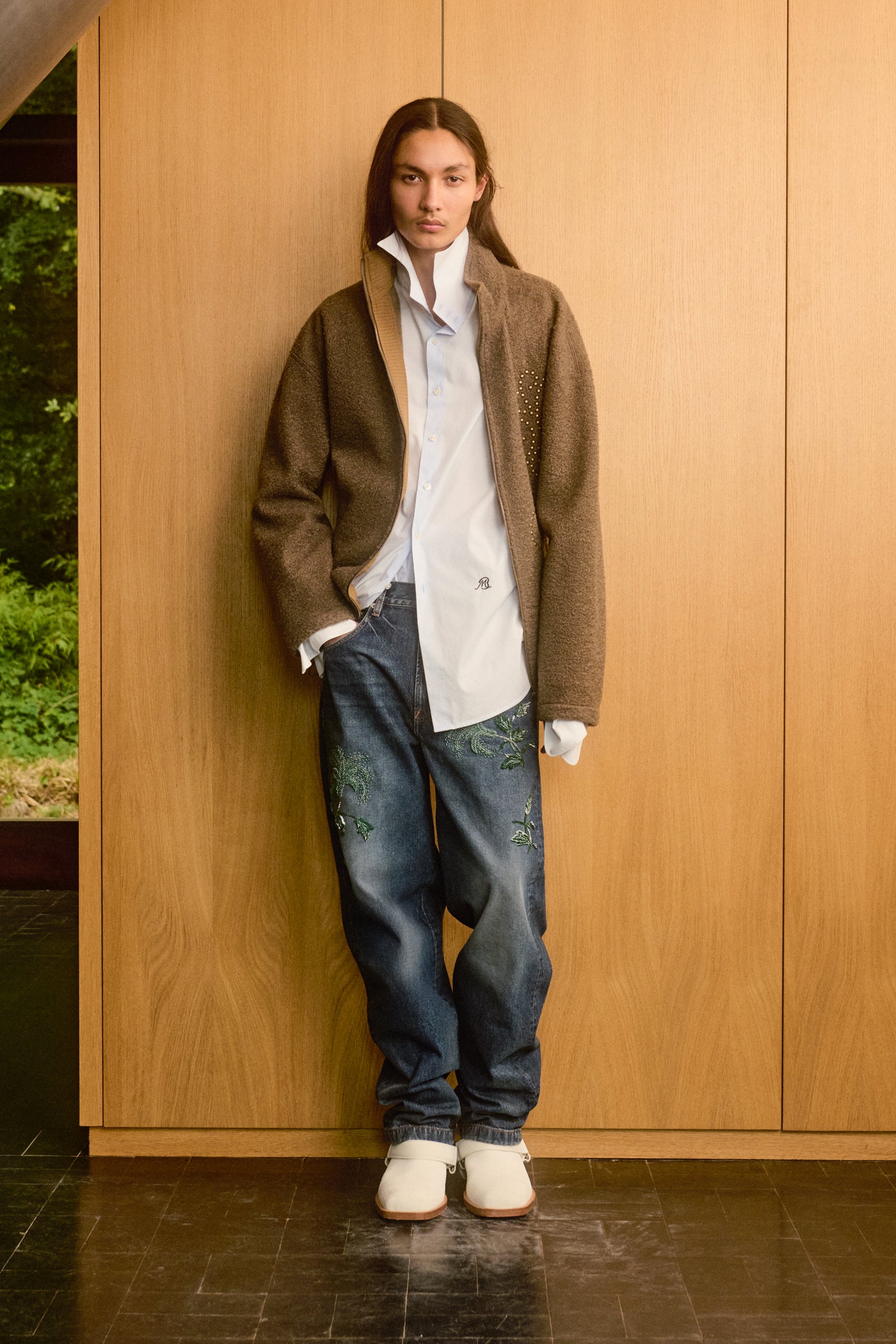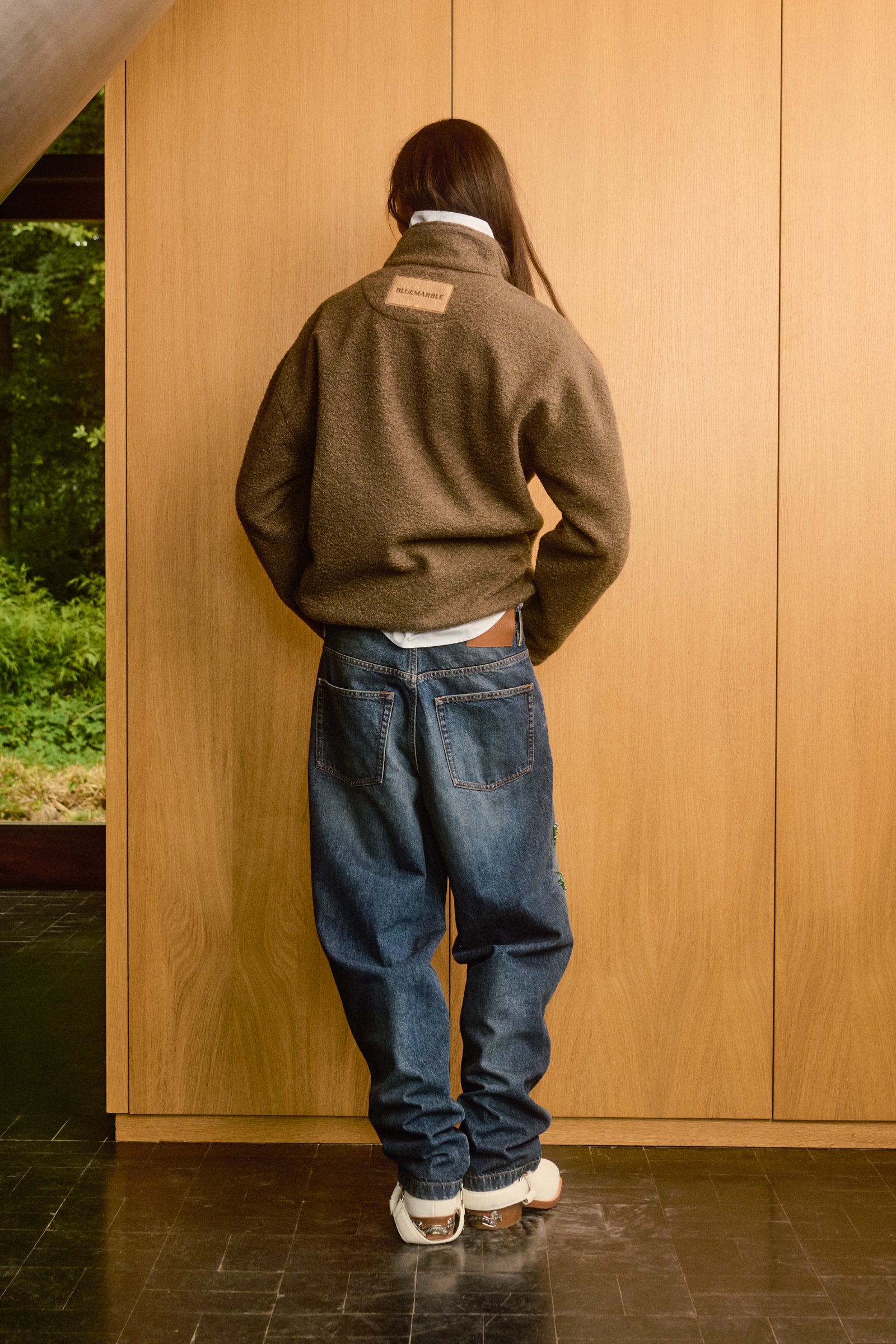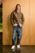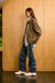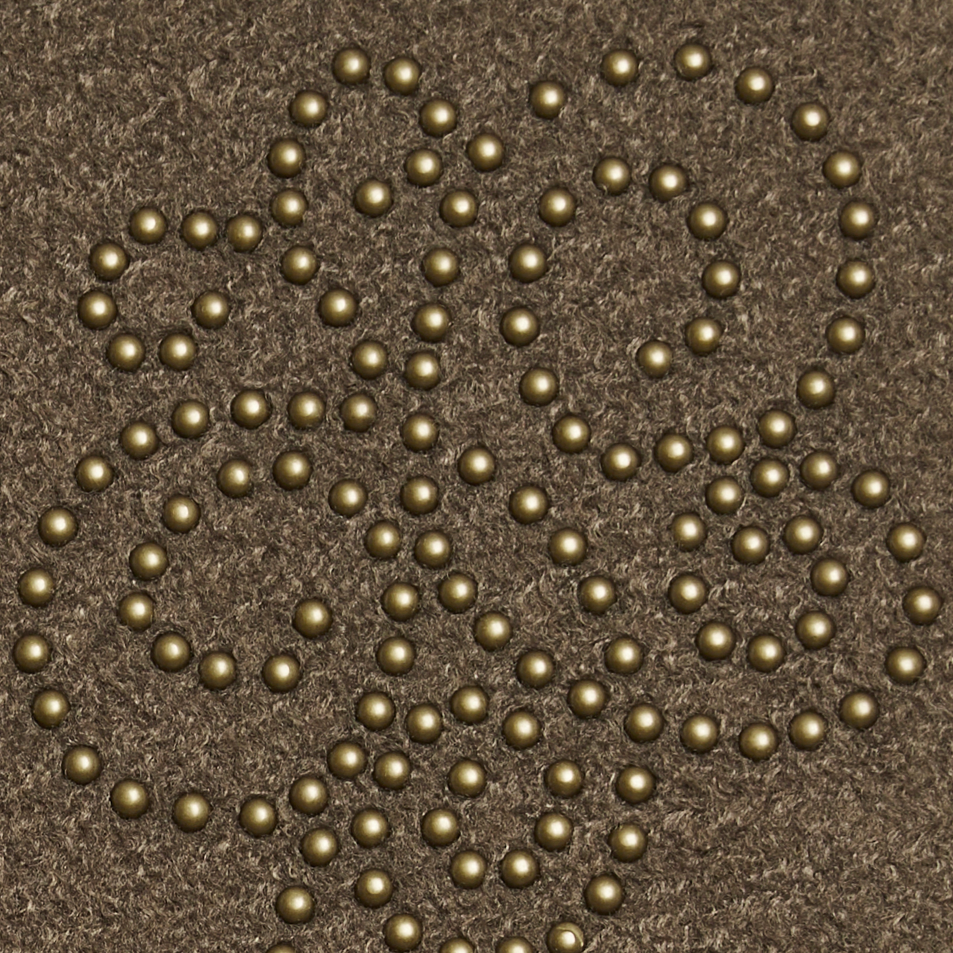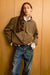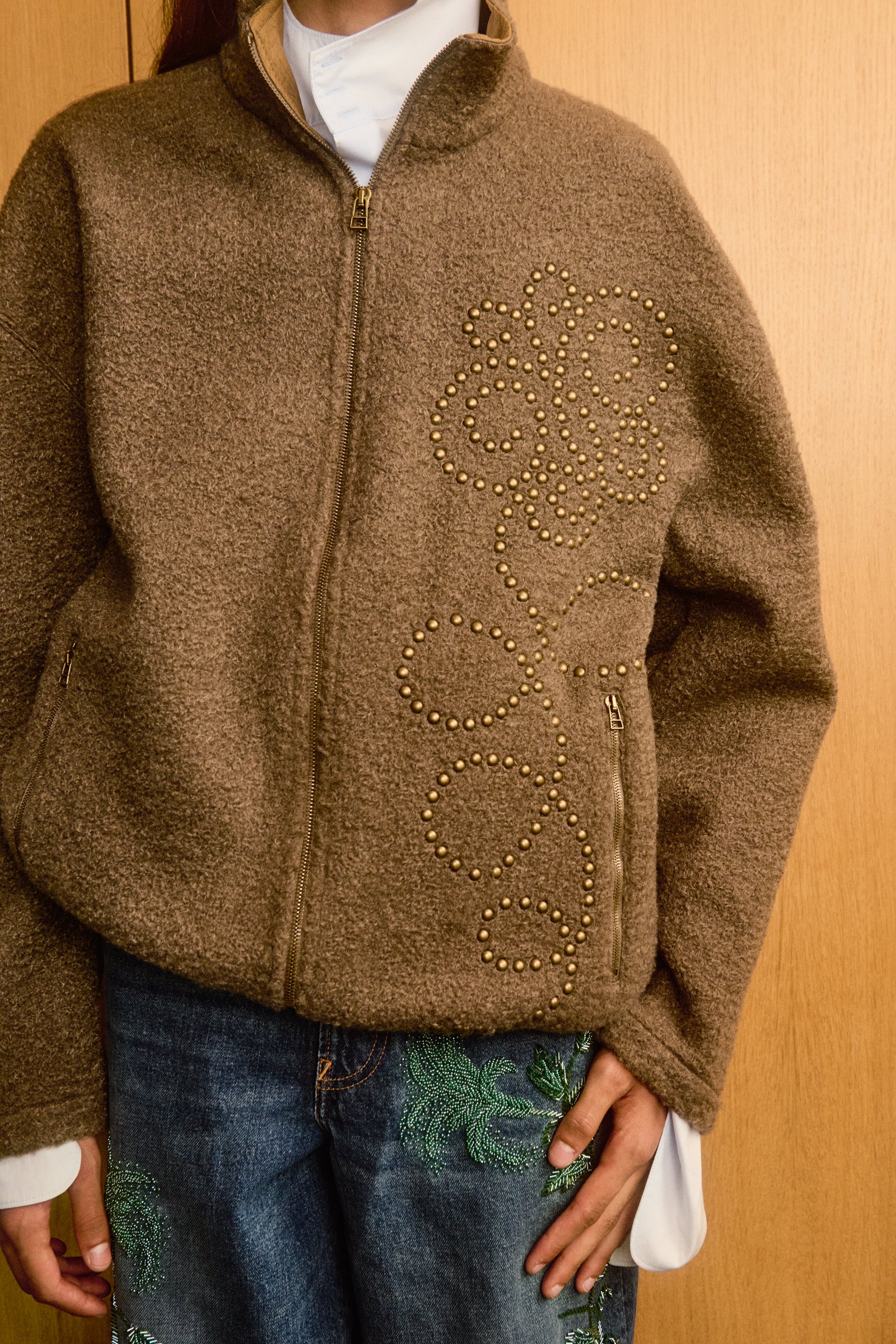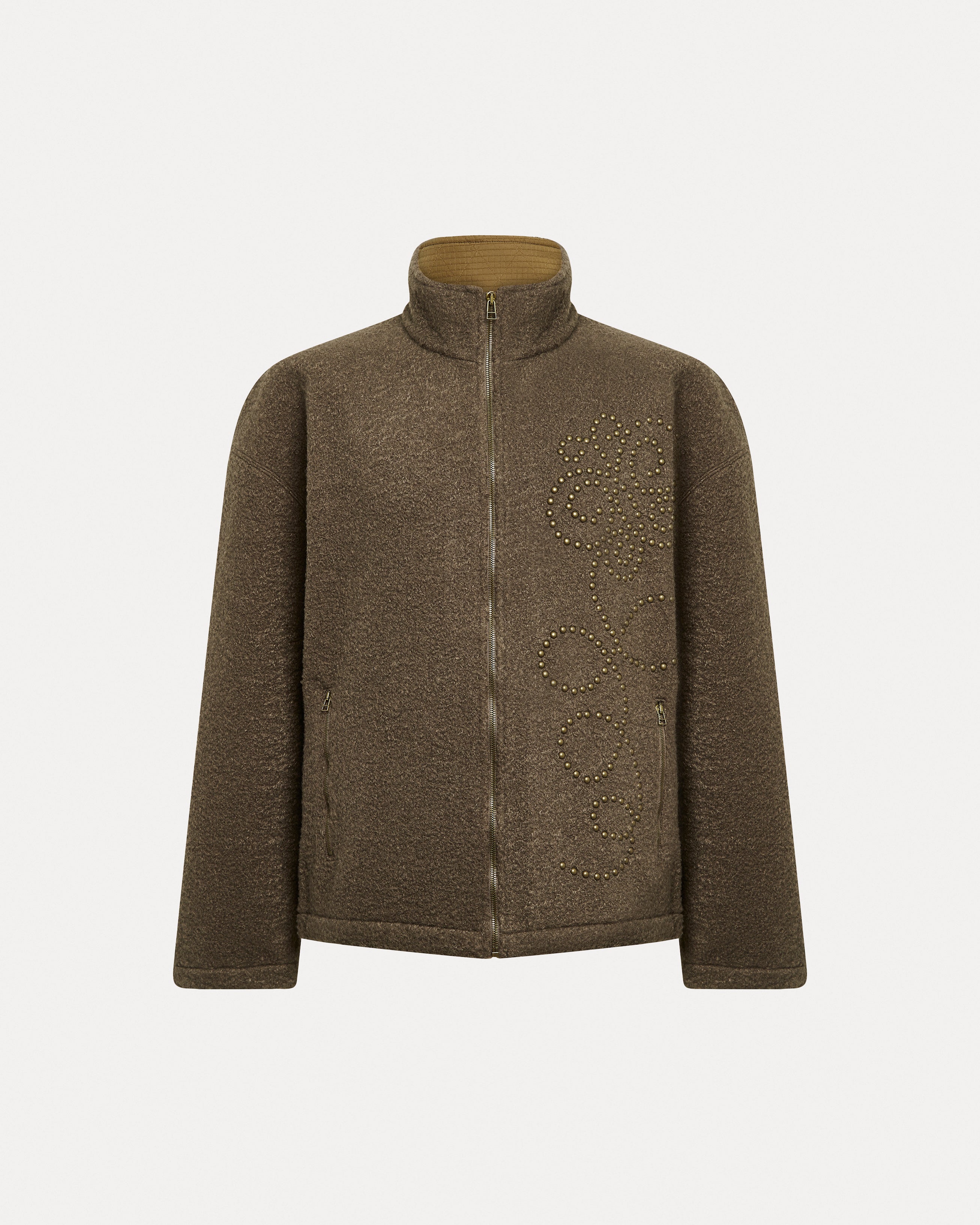 Veste polaire kaki zippée avec poches zippées, ourlet à cordon de serrage et col montant. Elle présente une patte de boutonnage matelassée en nylon et un motif floral en clous couleur rouille.