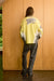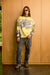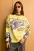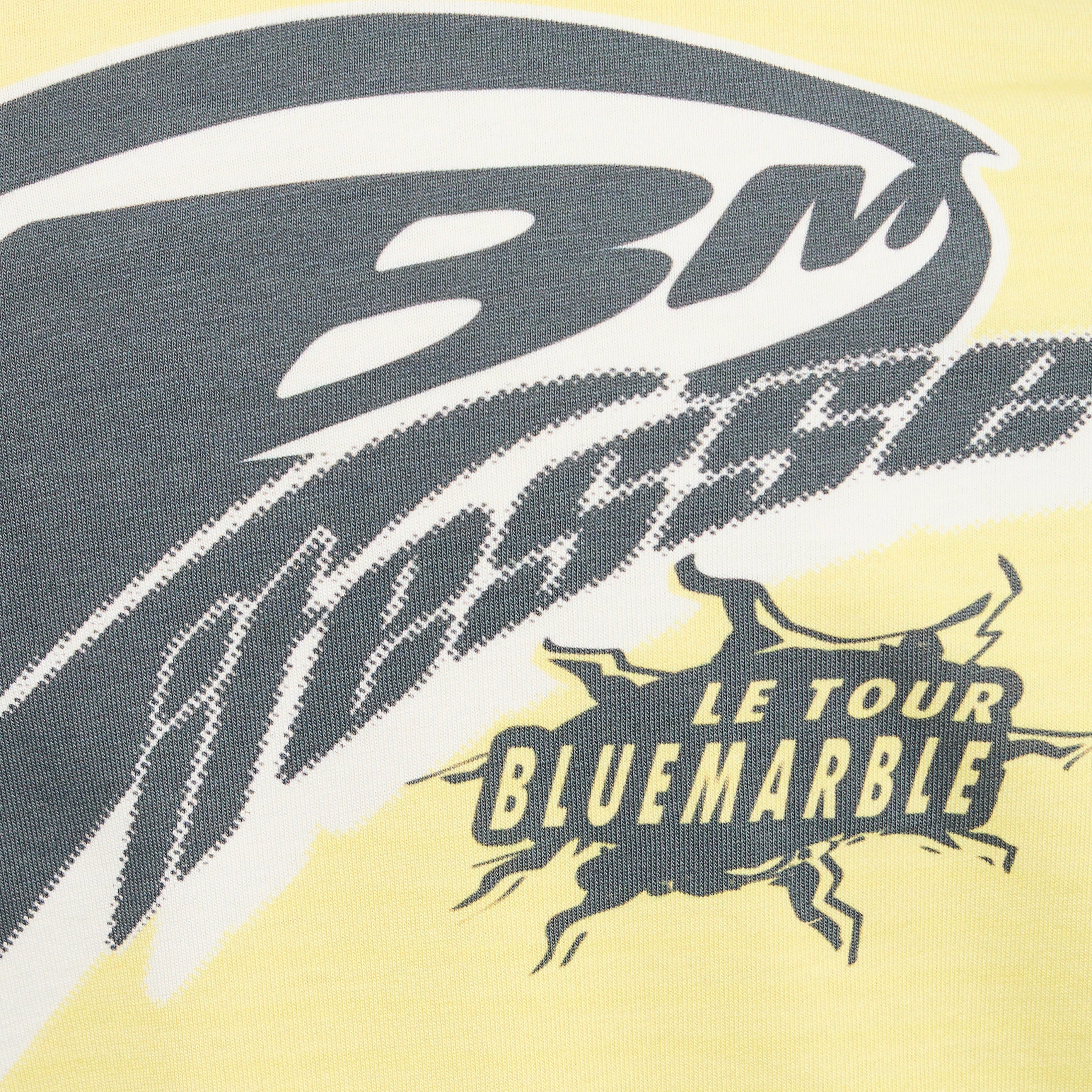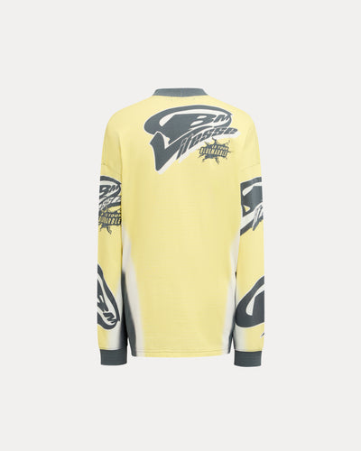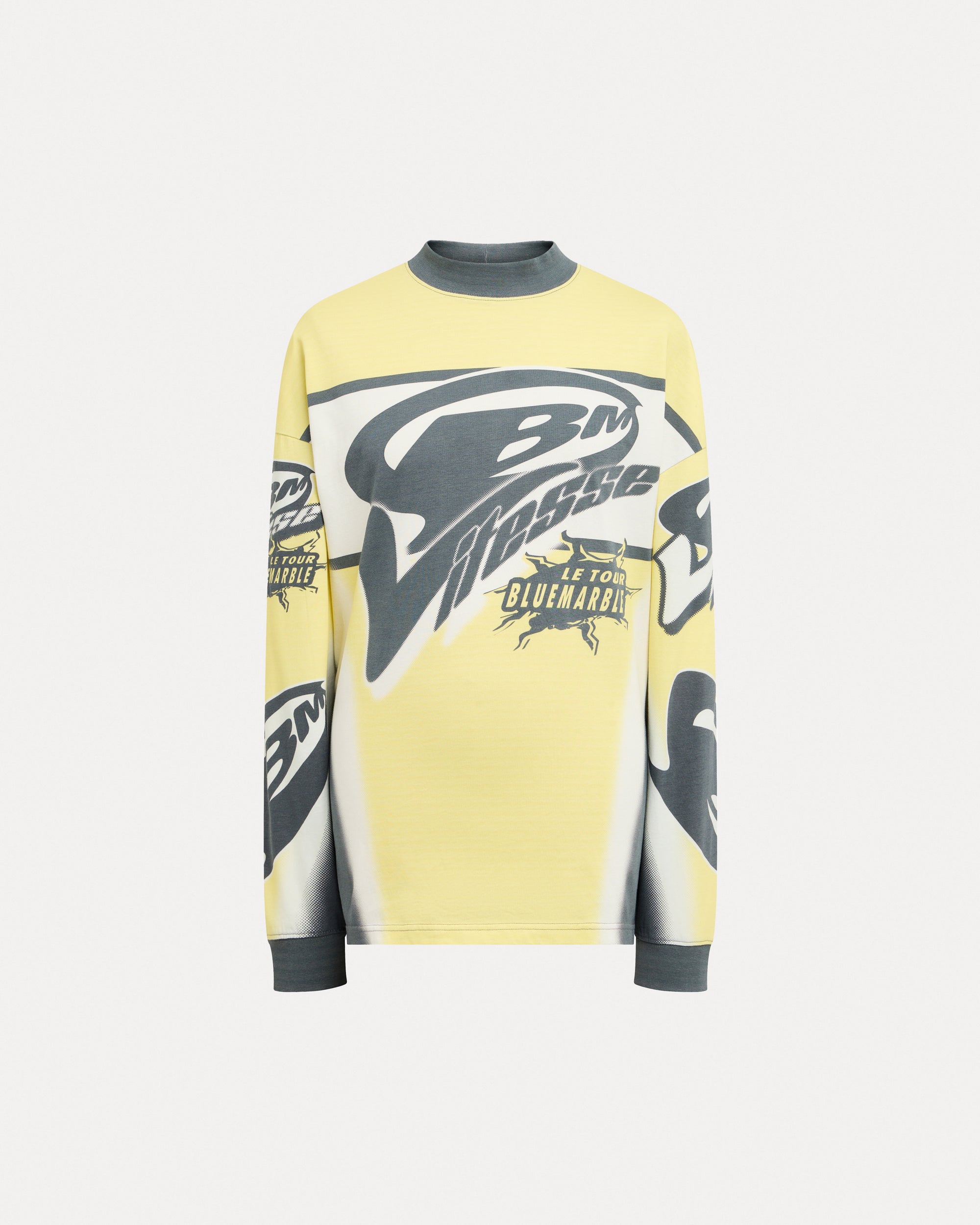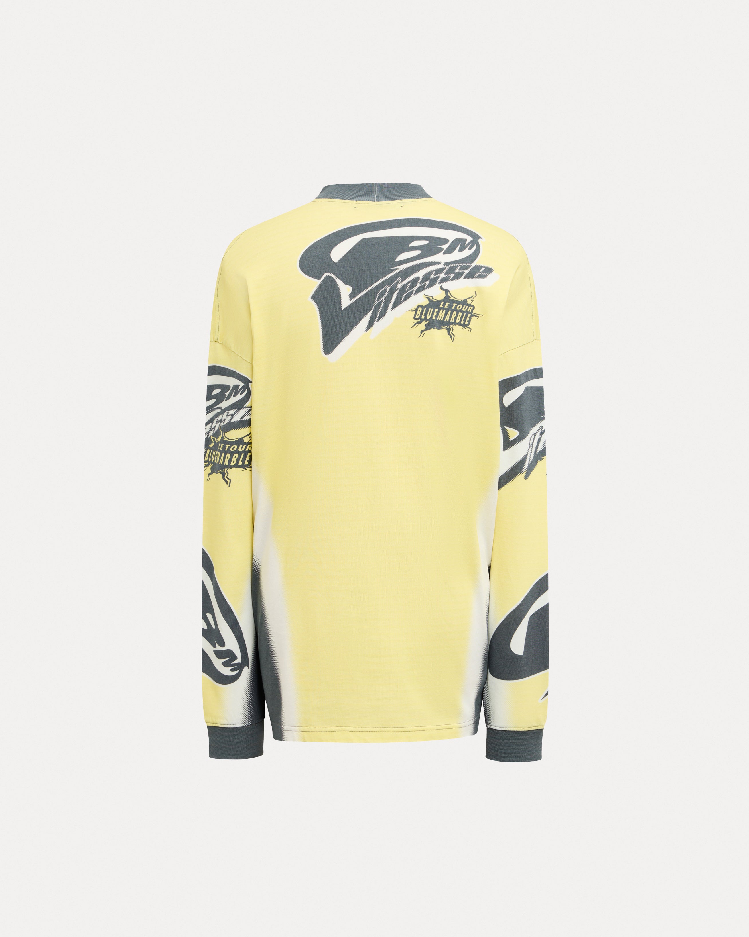 T-shirt oversize à manches longues dans des tons délavés de jaune et de gris, orné de motifs inspirés du motocross. Il présente des poignets côtelés, des épaules tombantes et un imprimé audacieux « Le Tour Bluemarble » sur le devant, le dos et les manches.