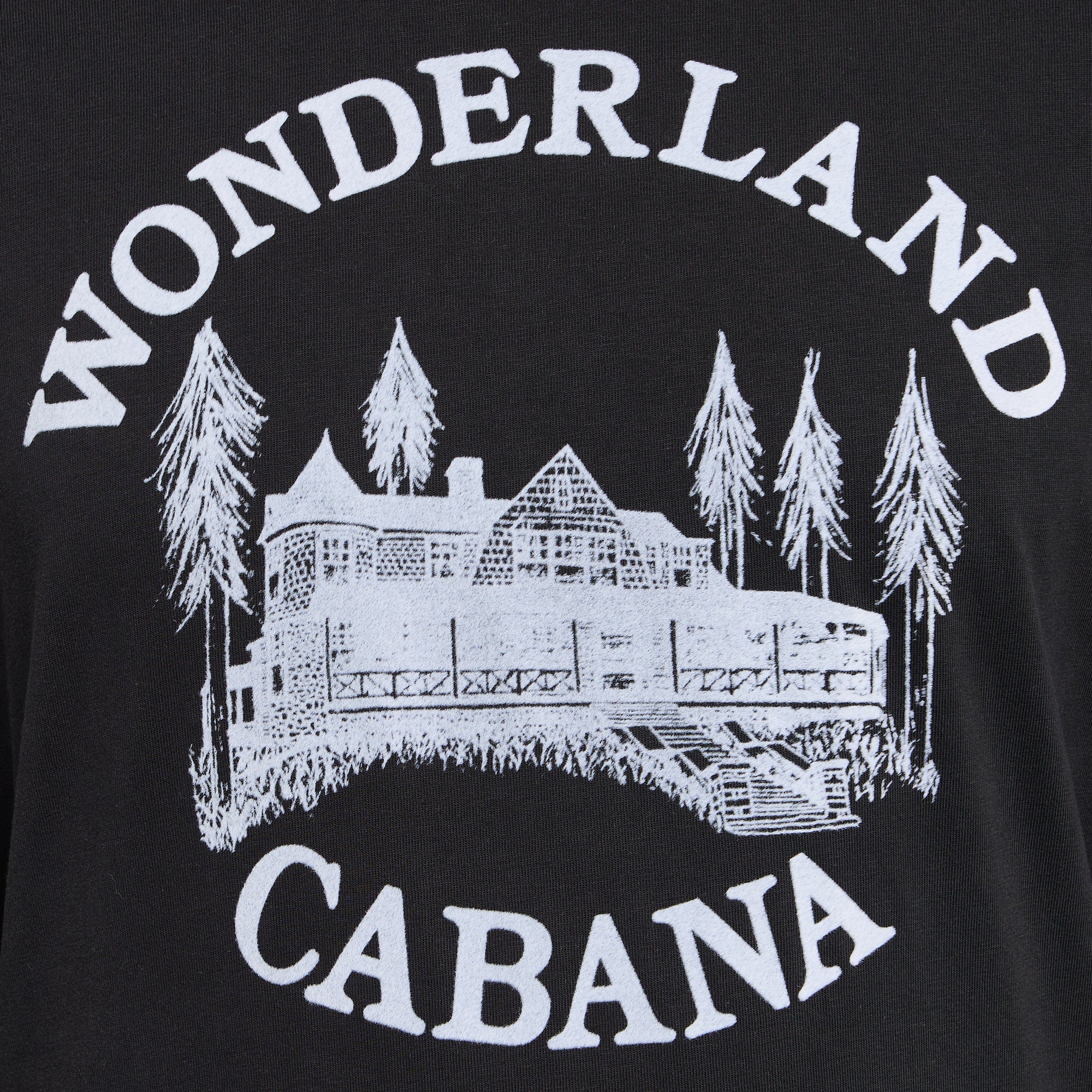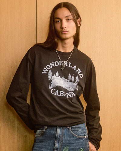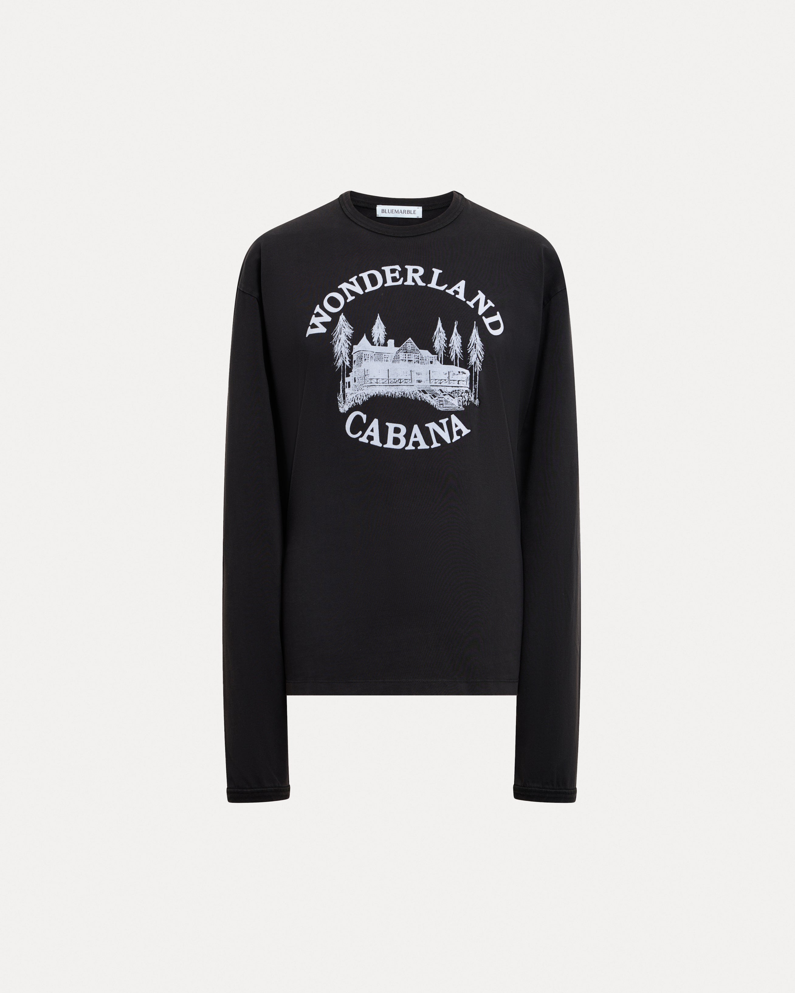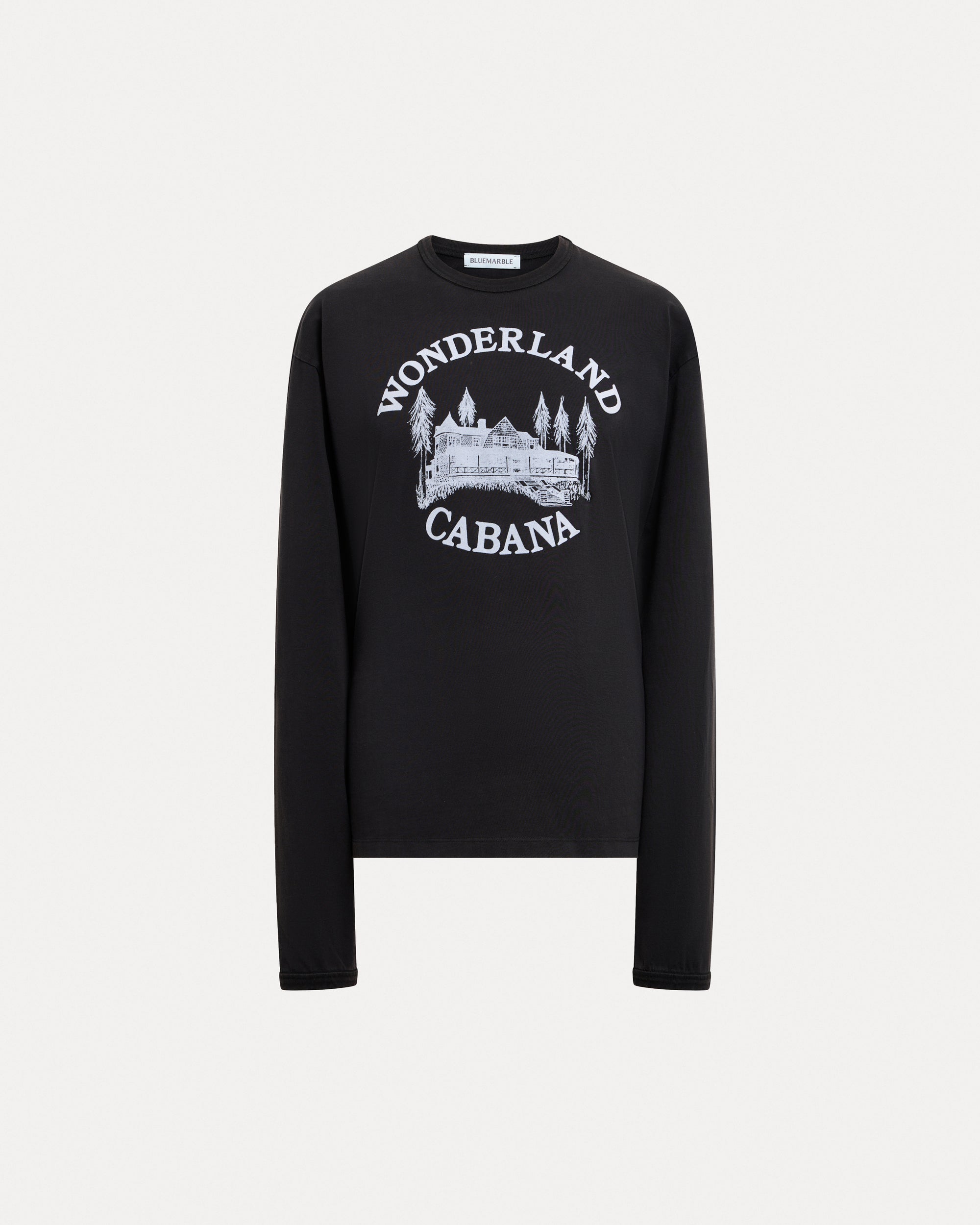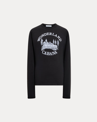 T-shirt à manches longues coupe classique en jersey noir délavé, poignets et ourlet côtelés. Inscription « Wonderland Cabana » floquée.