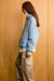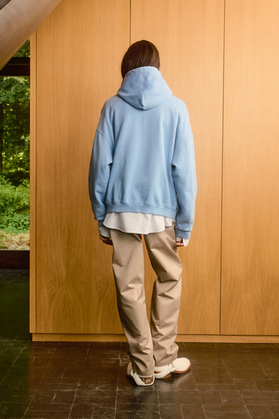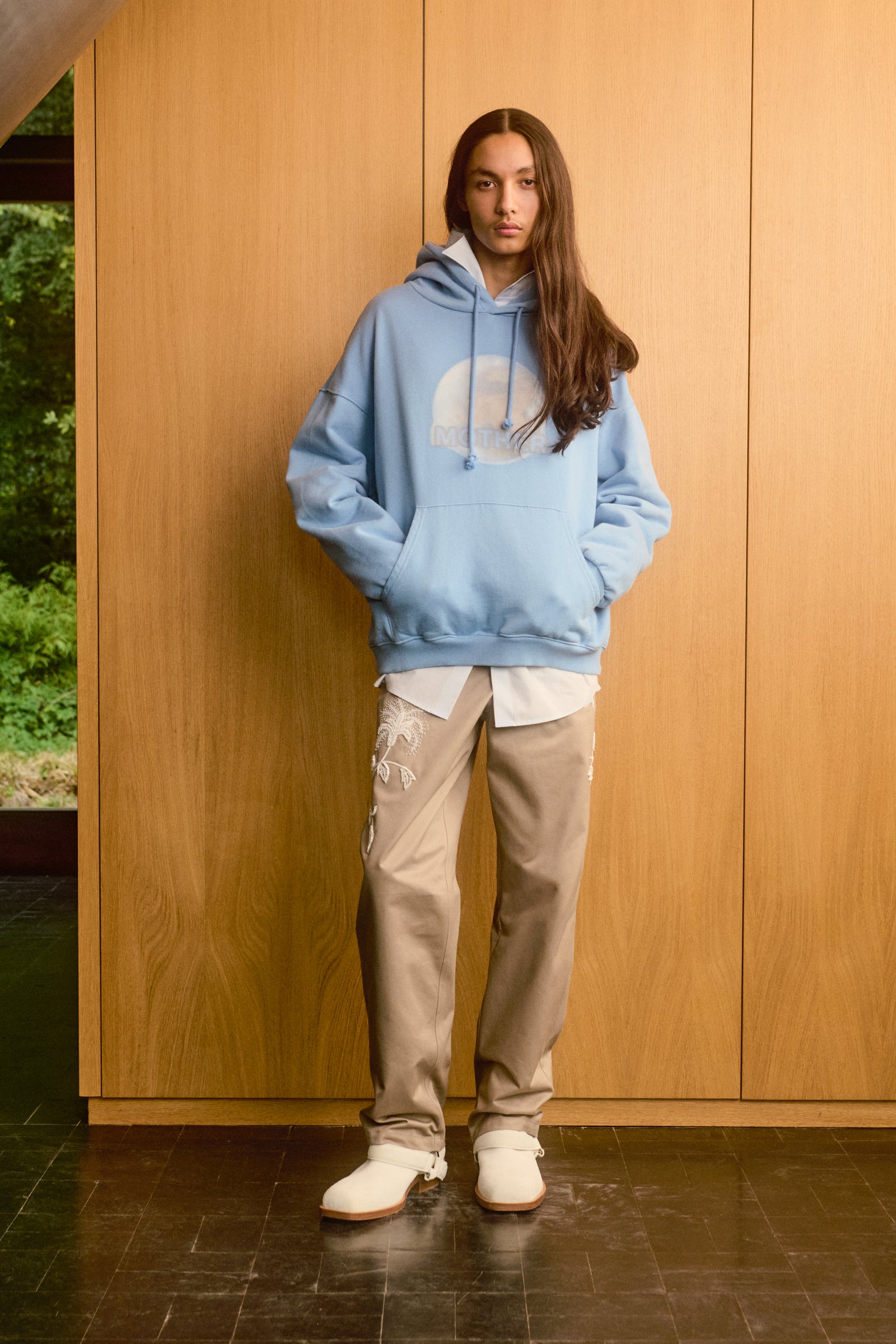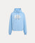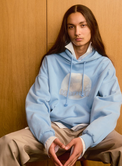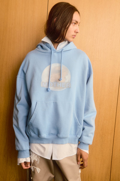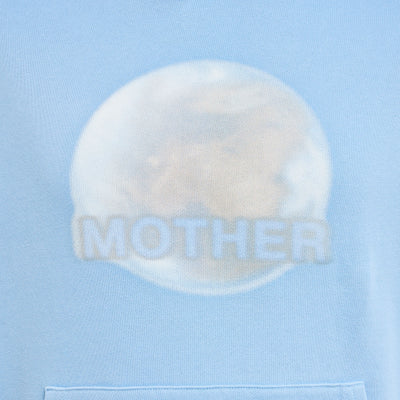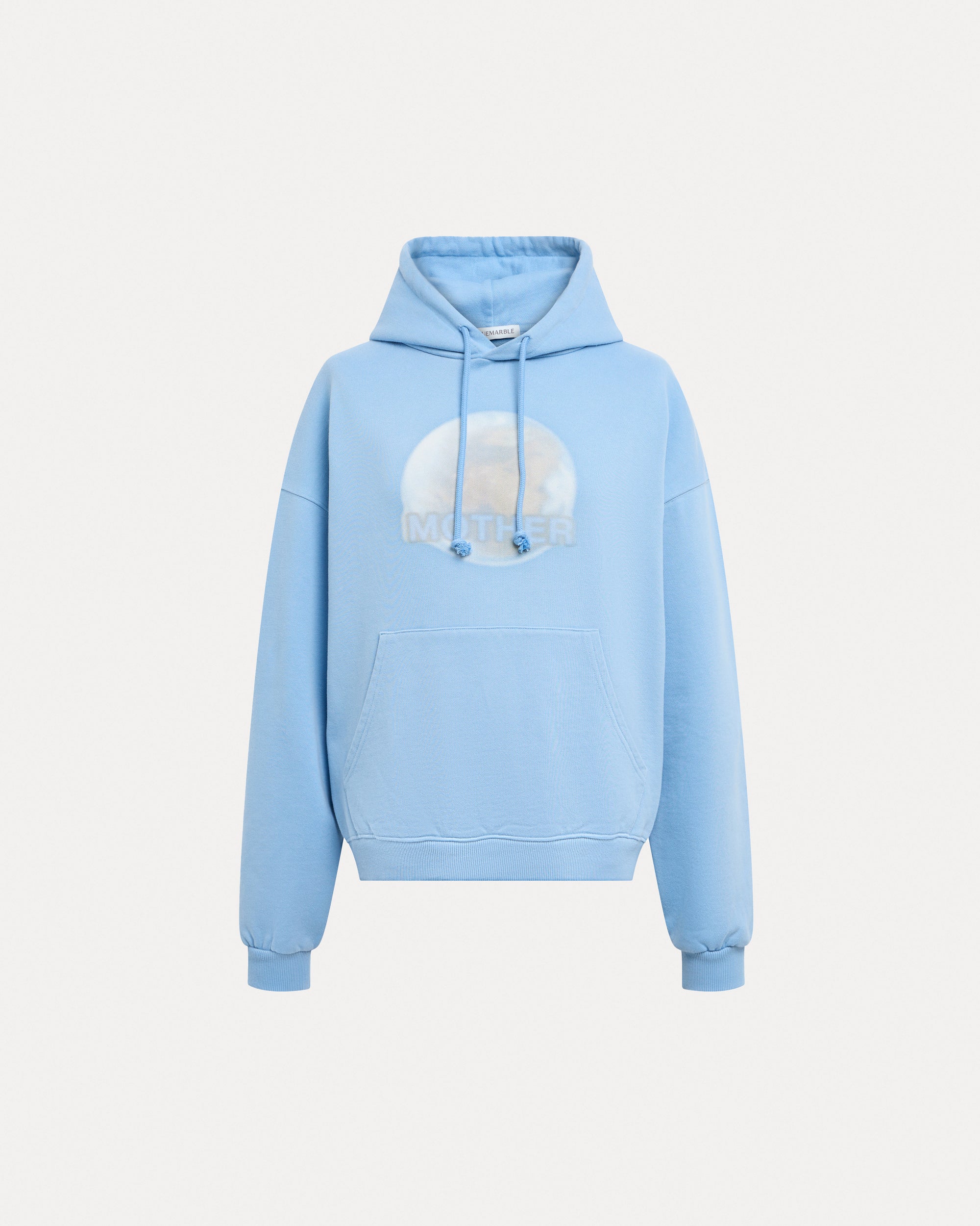 Sweat à capuche bleu délavé avec un imprimé numérique flou « Terre Mère ». Poche kangourou et coupe décontractée.