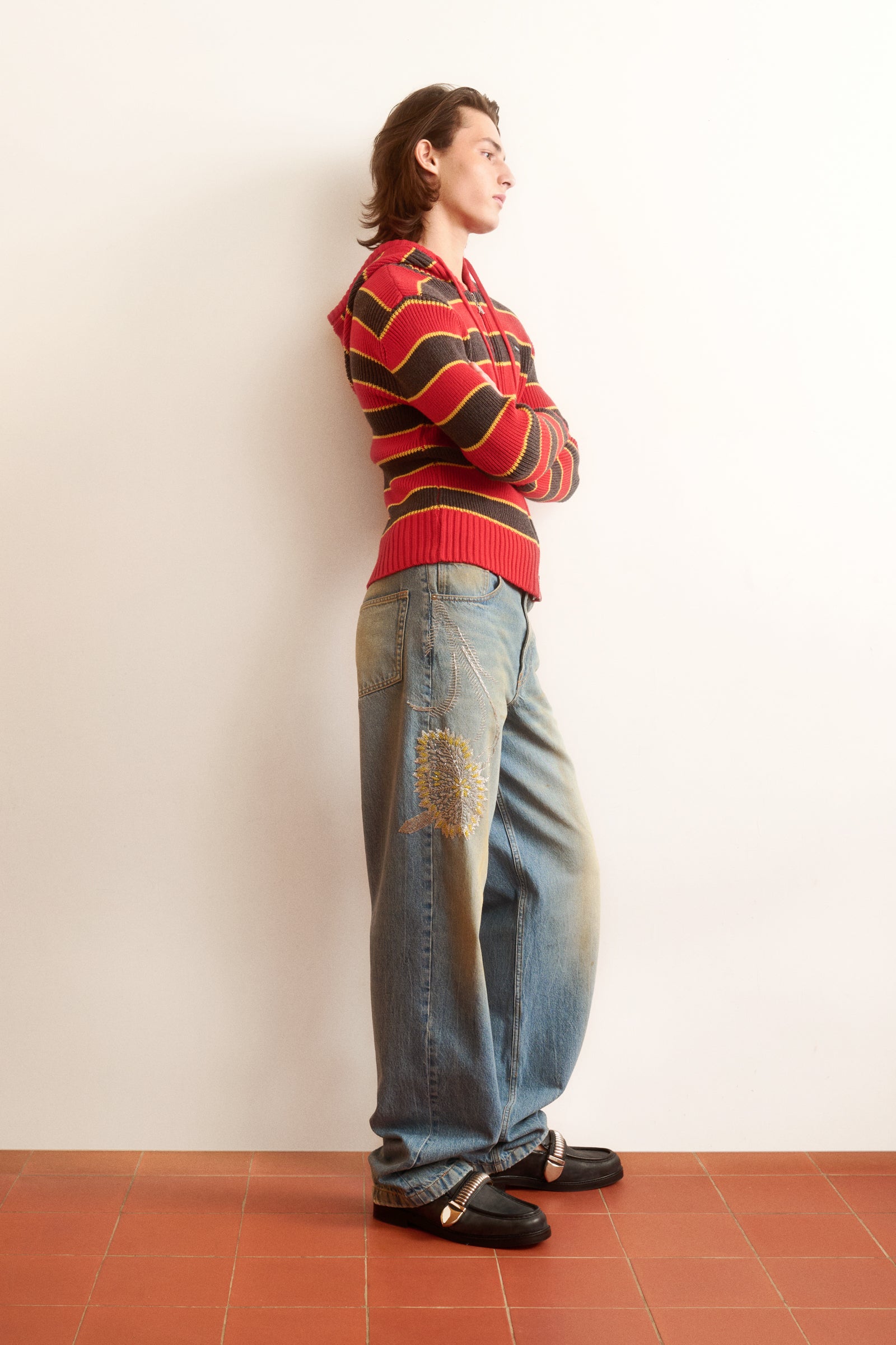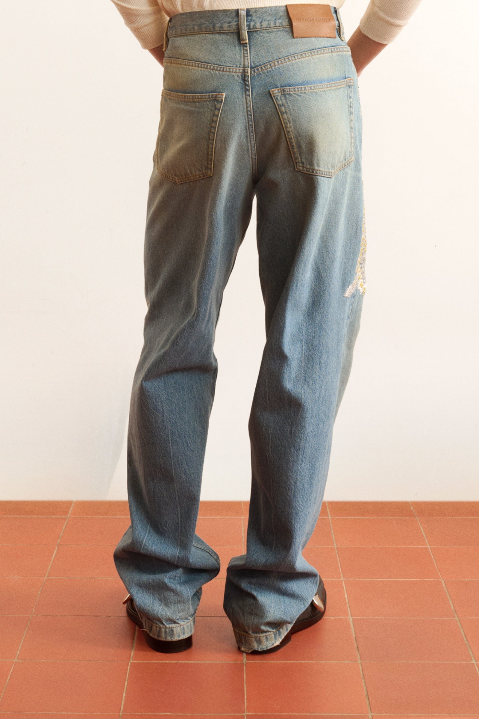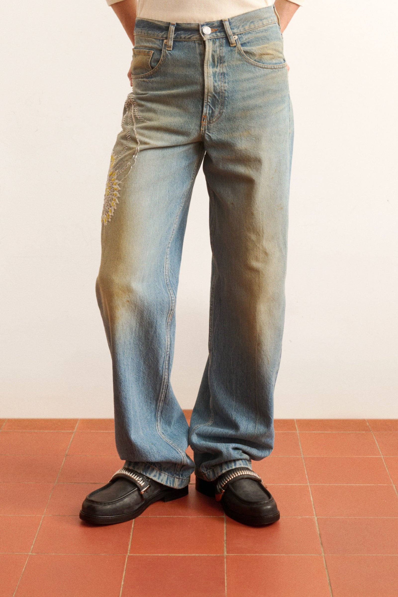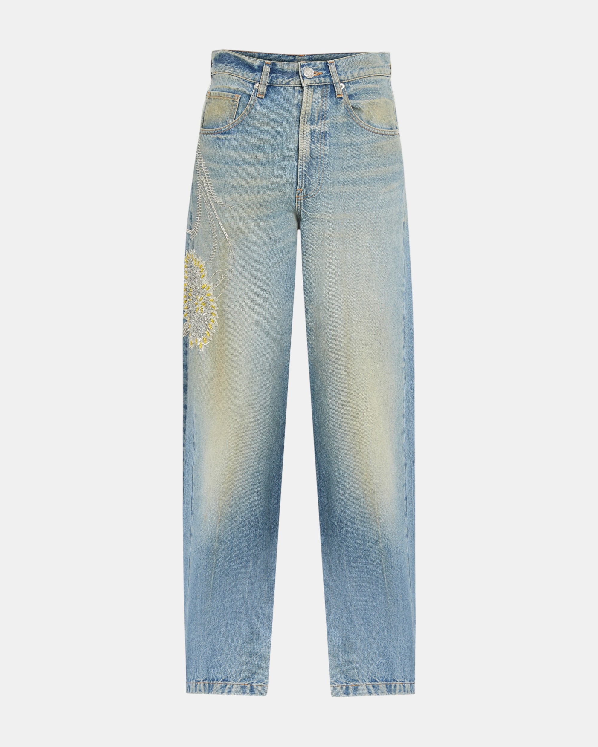 Beaded Flower Relaxed Jeans Bluemarble classic relaxed jeans. Hand-embroidered floral embellishment with beads in silver and yellow, and in various sizes.