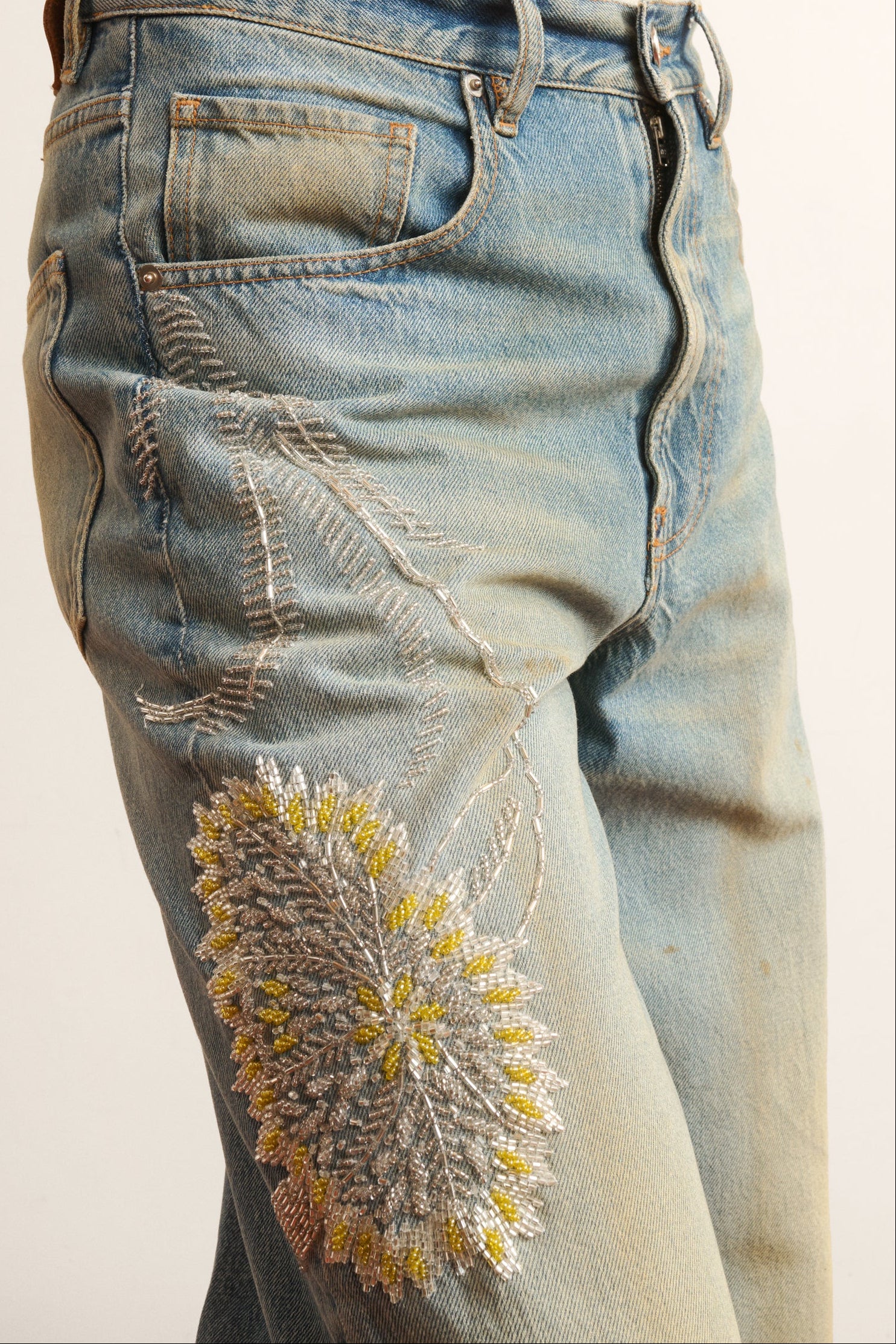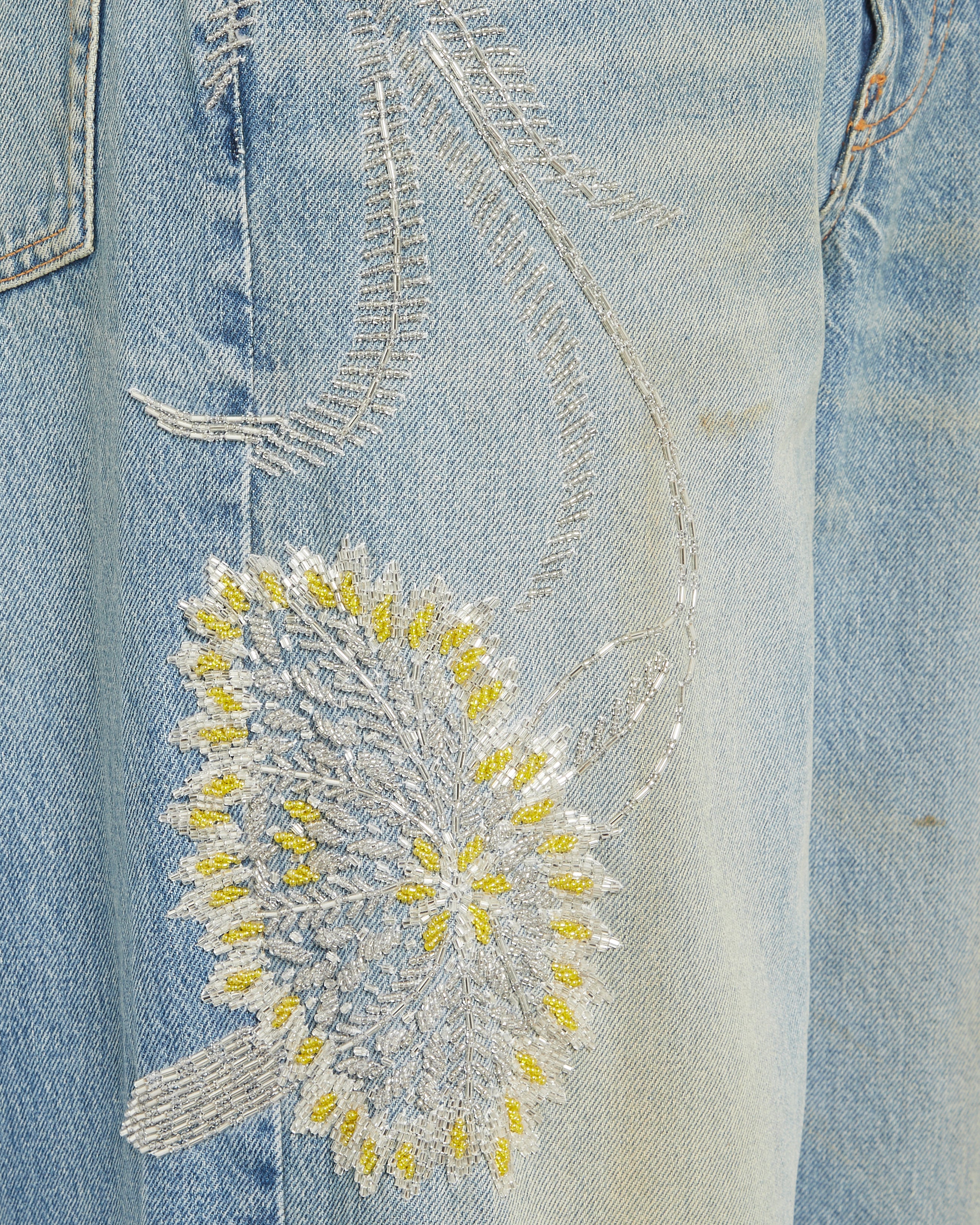 Bluemarble classic relaxed jeans. Hand-embroidered floral embellishment with beads in silver and yellow, and in various sizes.