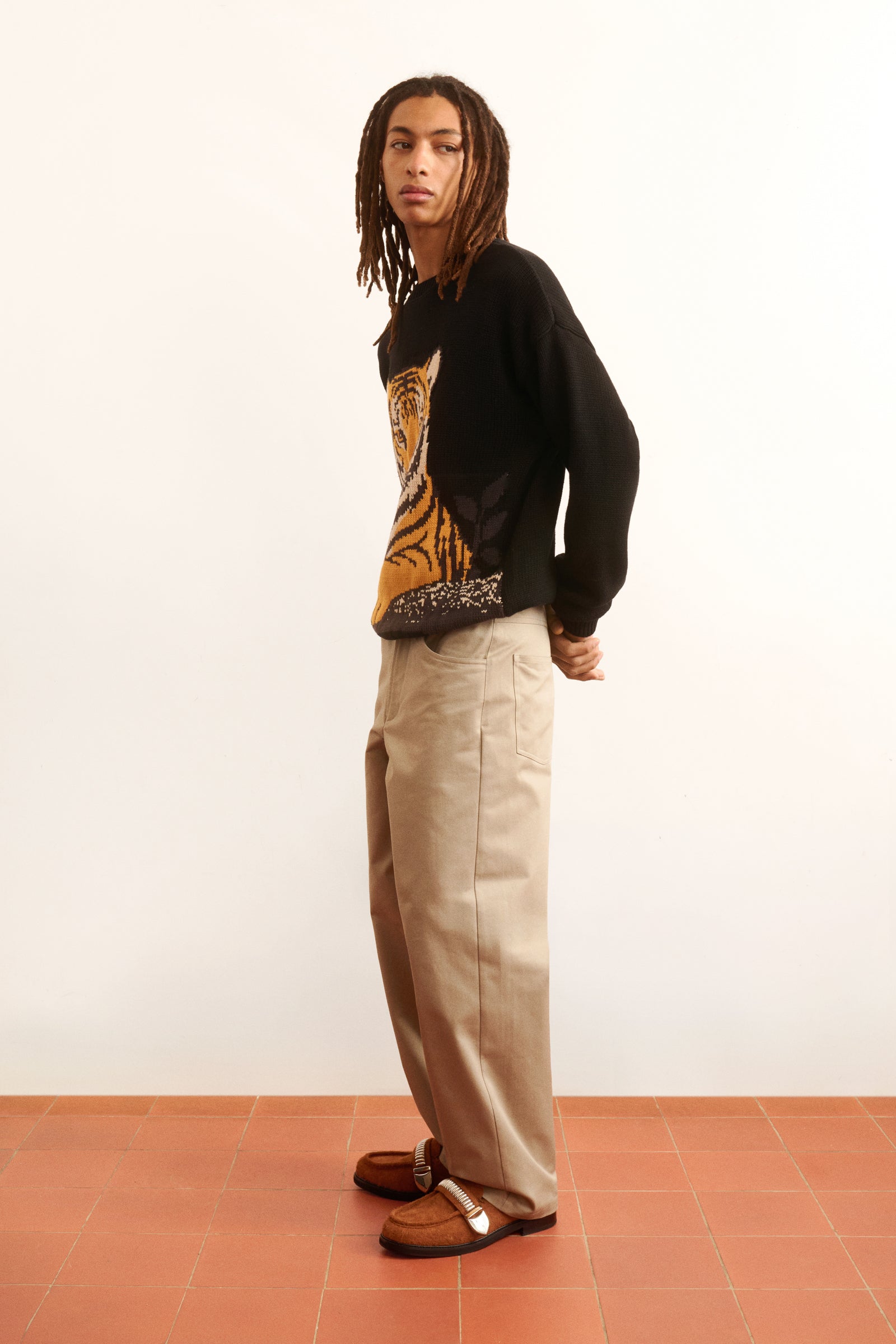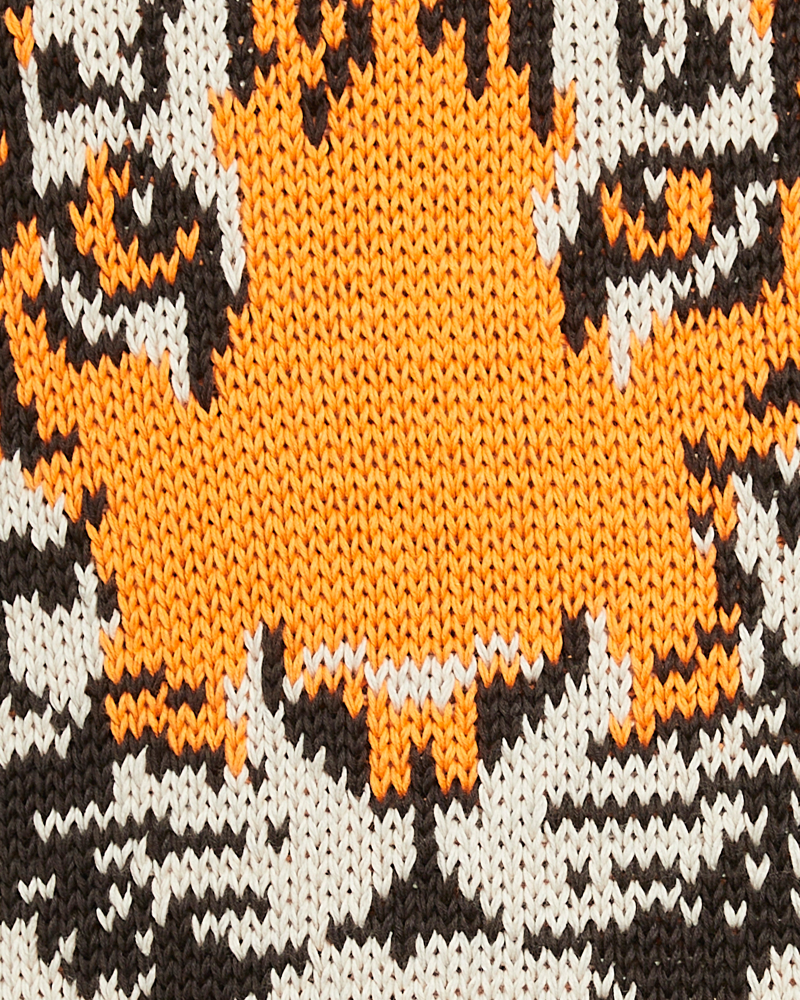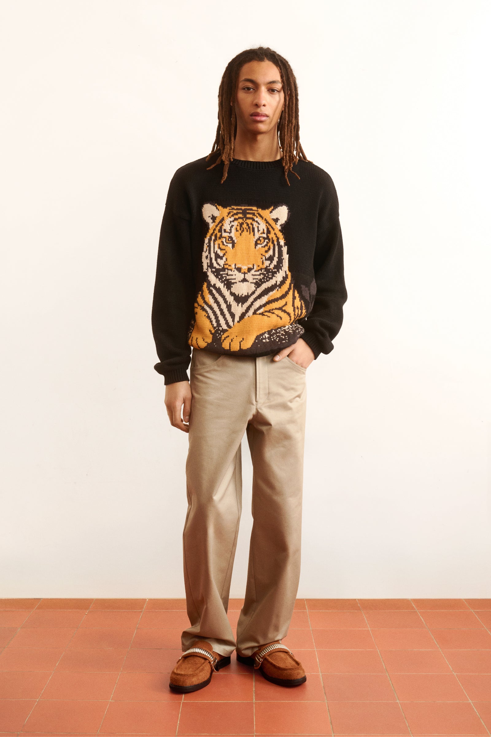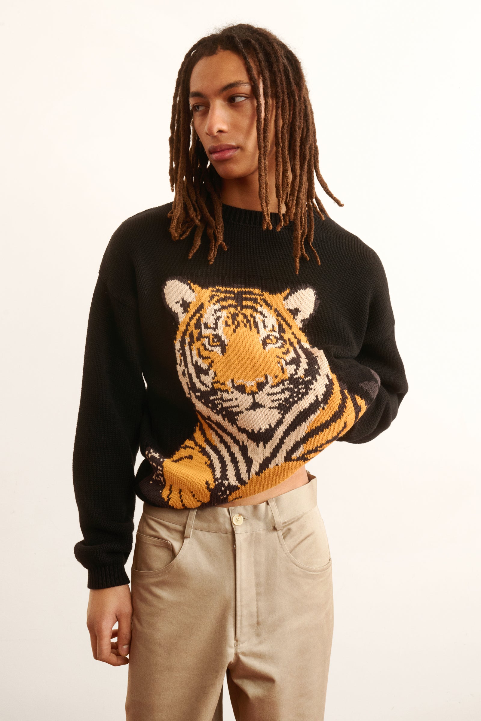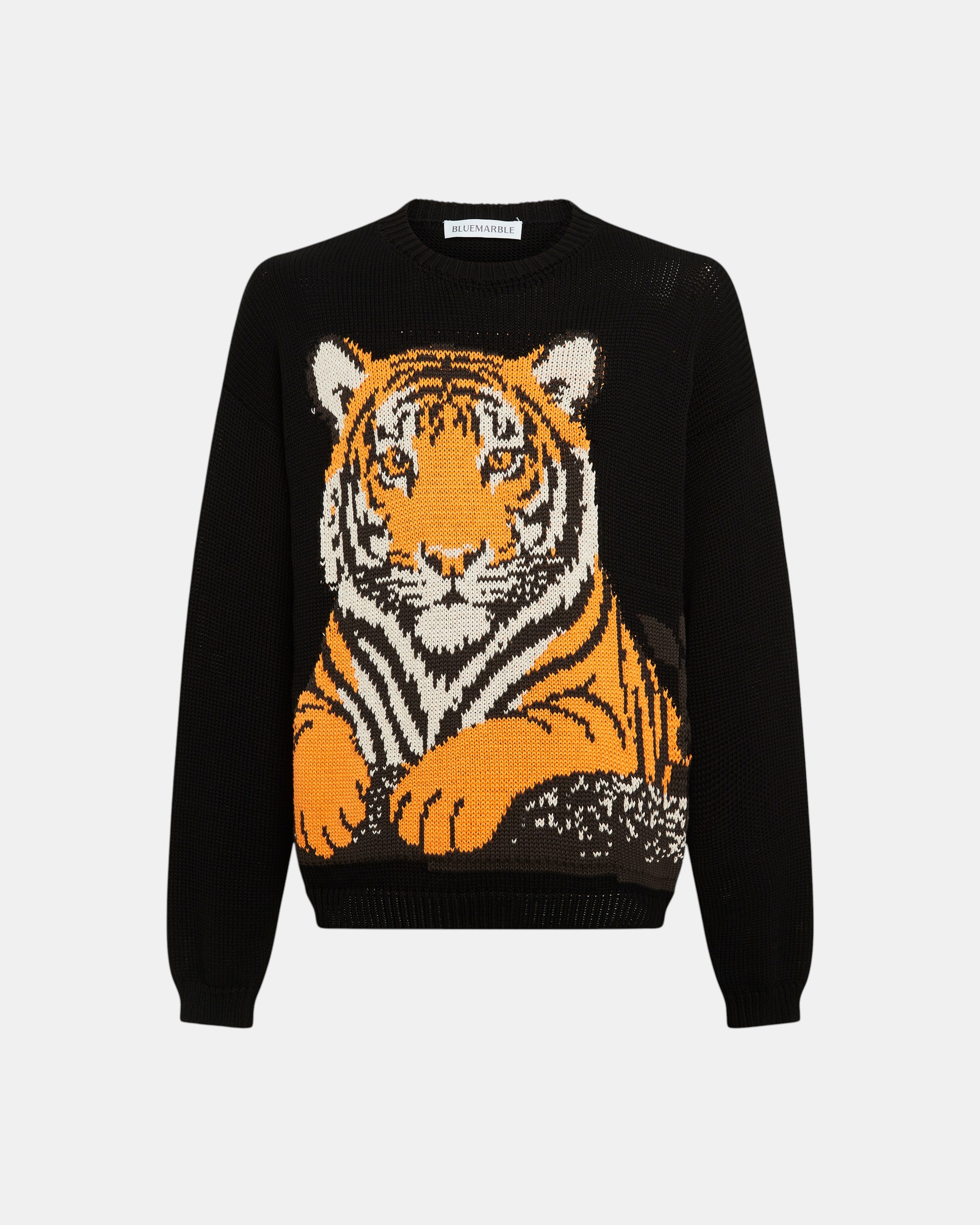 Tiger Intarsia Jumper Relaxed fit knitted jumper with round neck, drop shoulders, and long sleeves in breathable cotton yarn, featuring intarsia technique. Tiger motif design.