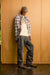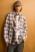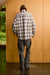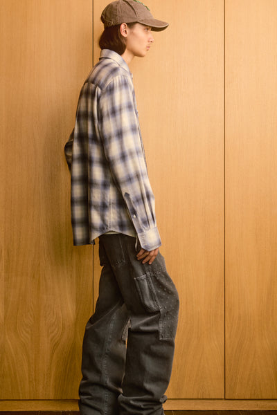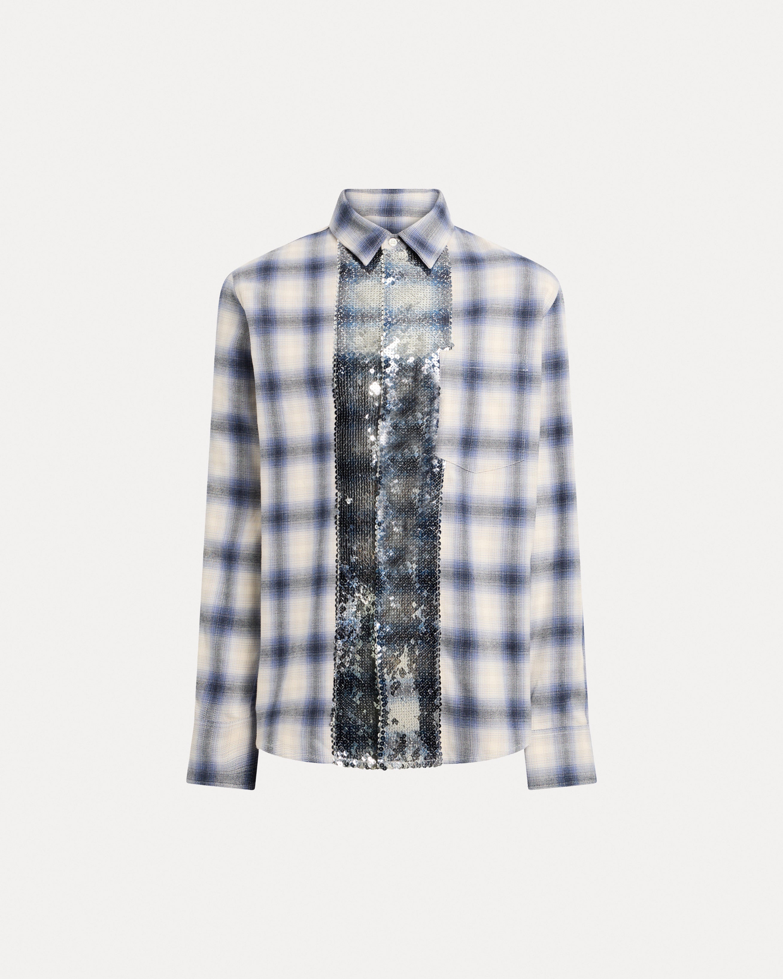 Plaid shirt in shades of white and blue with a double placket. Features a sequinned bib printed in a matching tartan motif.