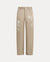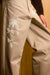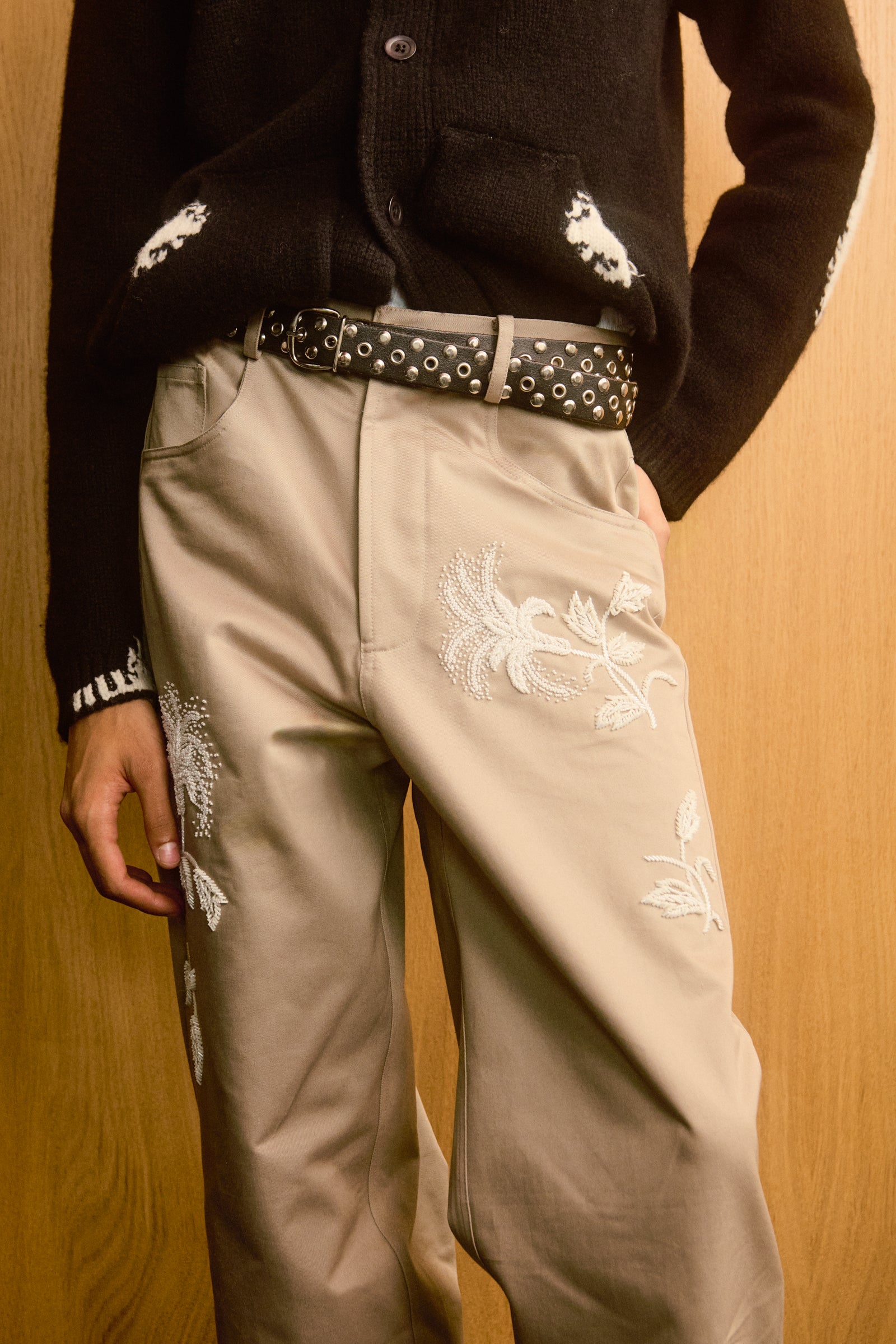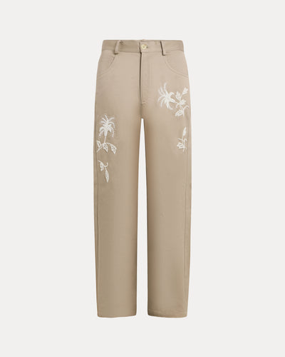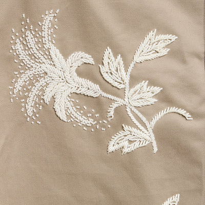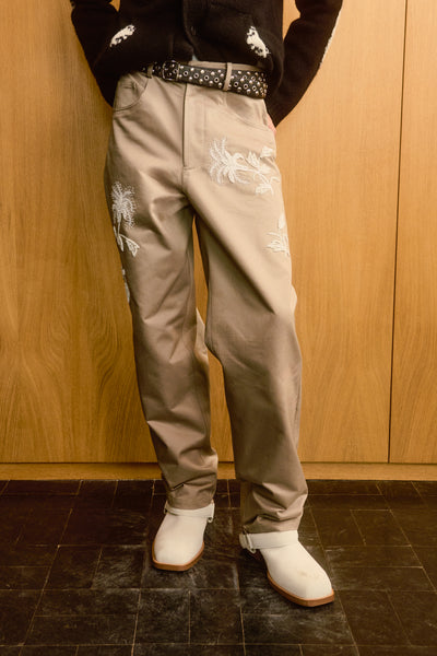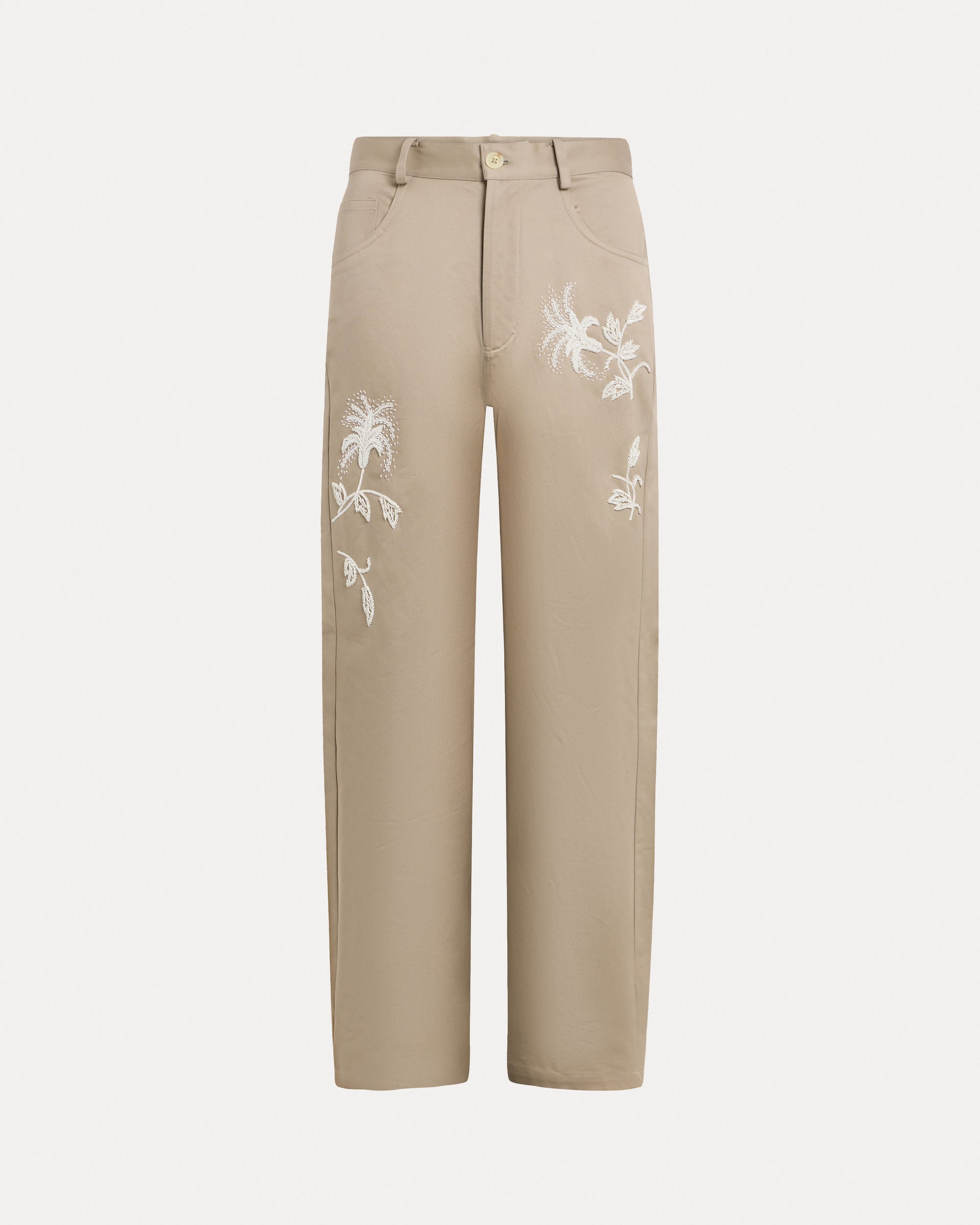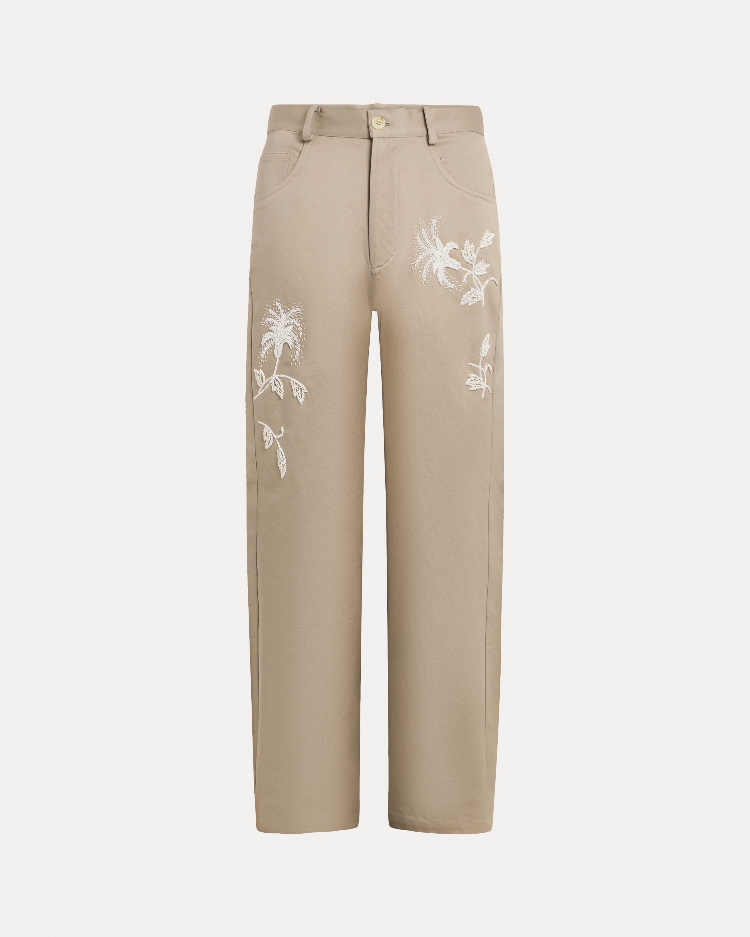 Relaxed-fit premium cotton twill chinos in sand. Features five classic pockets, a button closure, and intricate hand-embroidered botanical patterns with mixed white beads along the legs.