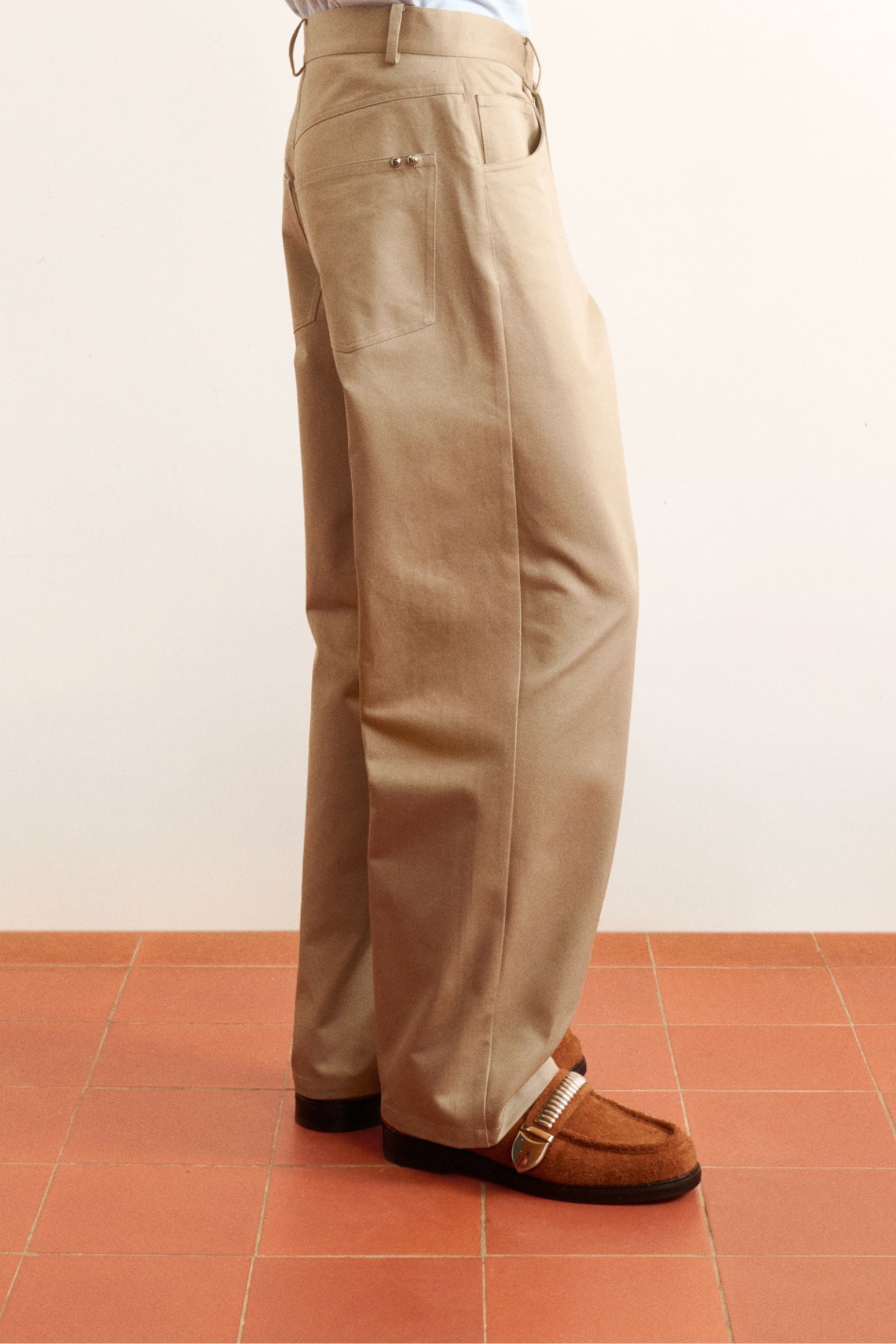 Relaxed fit chino pants in soft beige in crispy cotton gabardin, with belt loops, button and zip closure, curved front pockets, and a clean full-length finish.