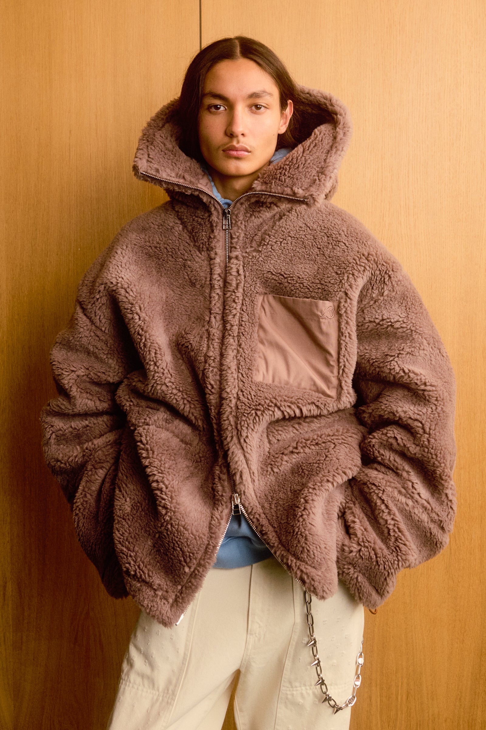 Oversized faux shearling hooded jacket in khaki with drawstring adjustments at the waist and hem. Features zippered side pockets, a leather-studded jacron on the back, and cotton lining.
