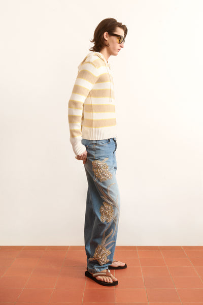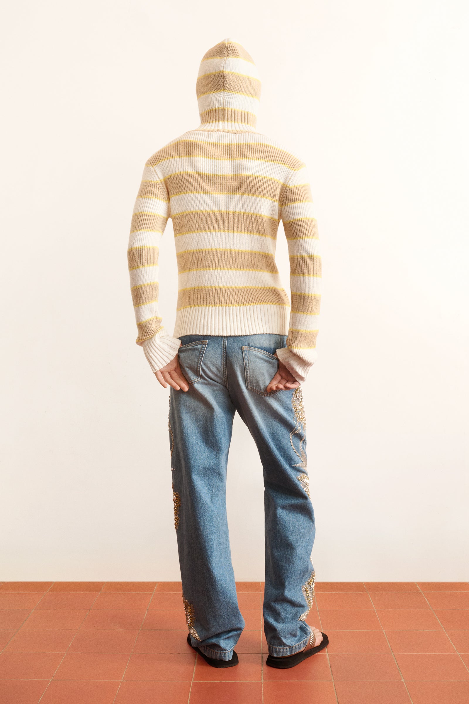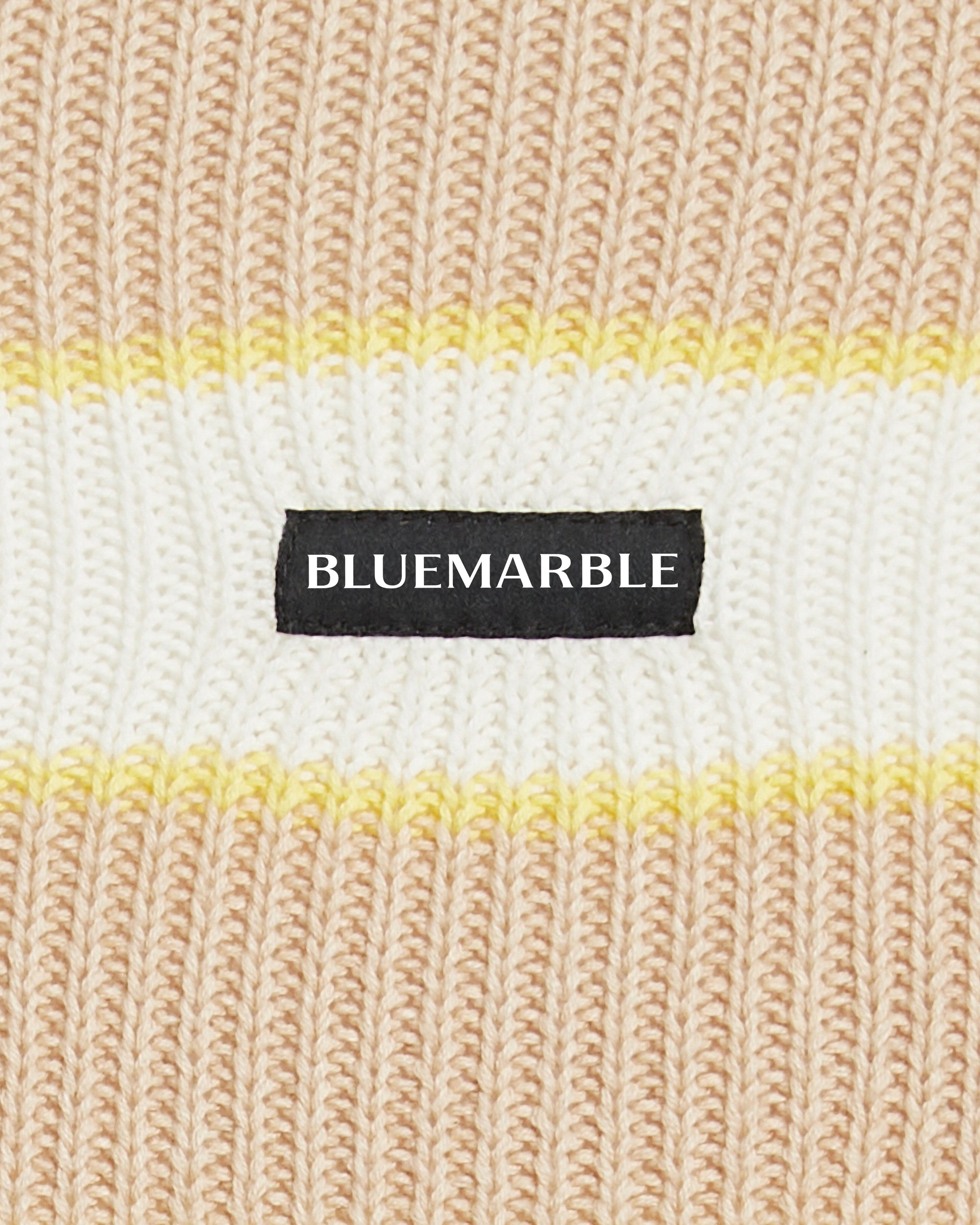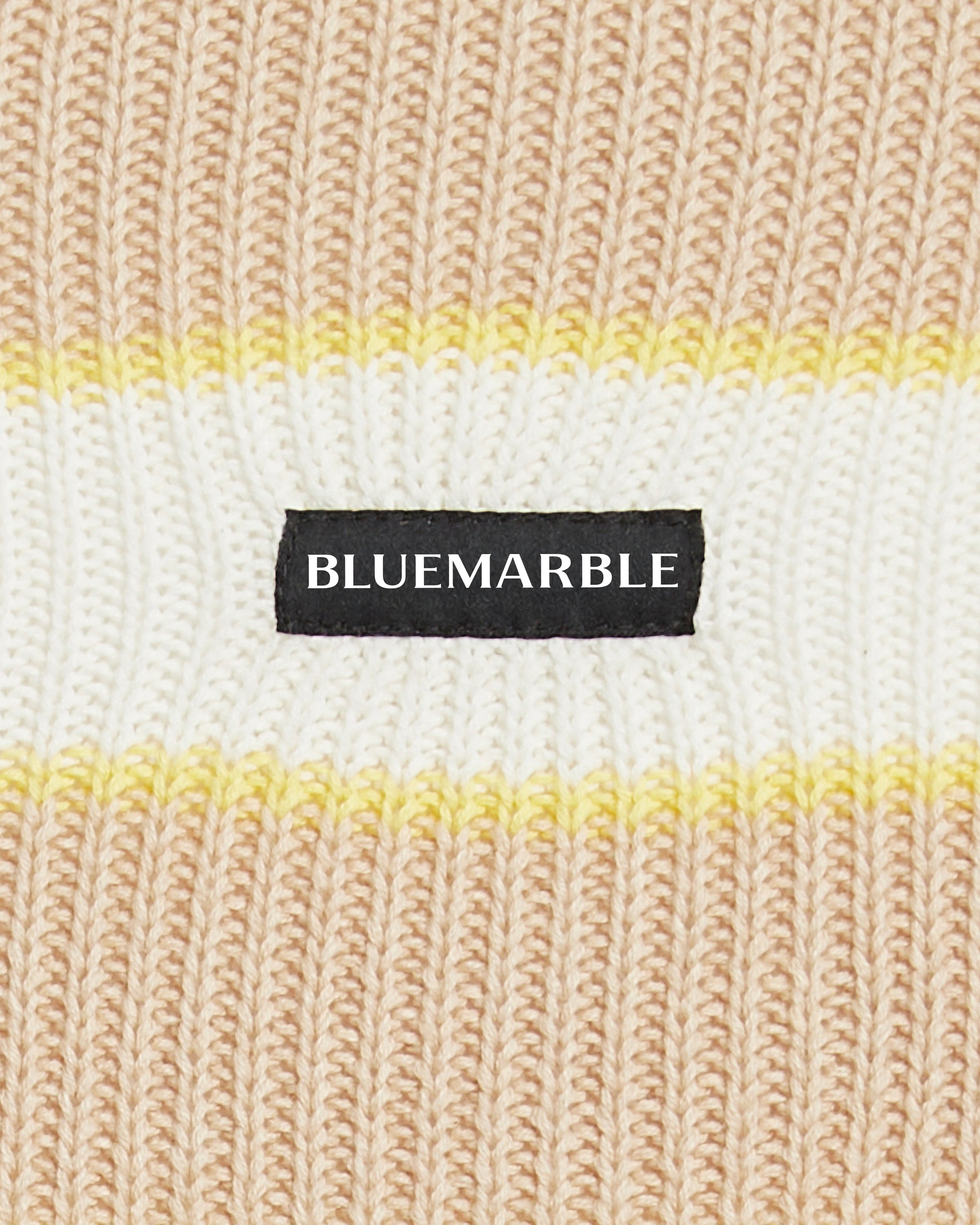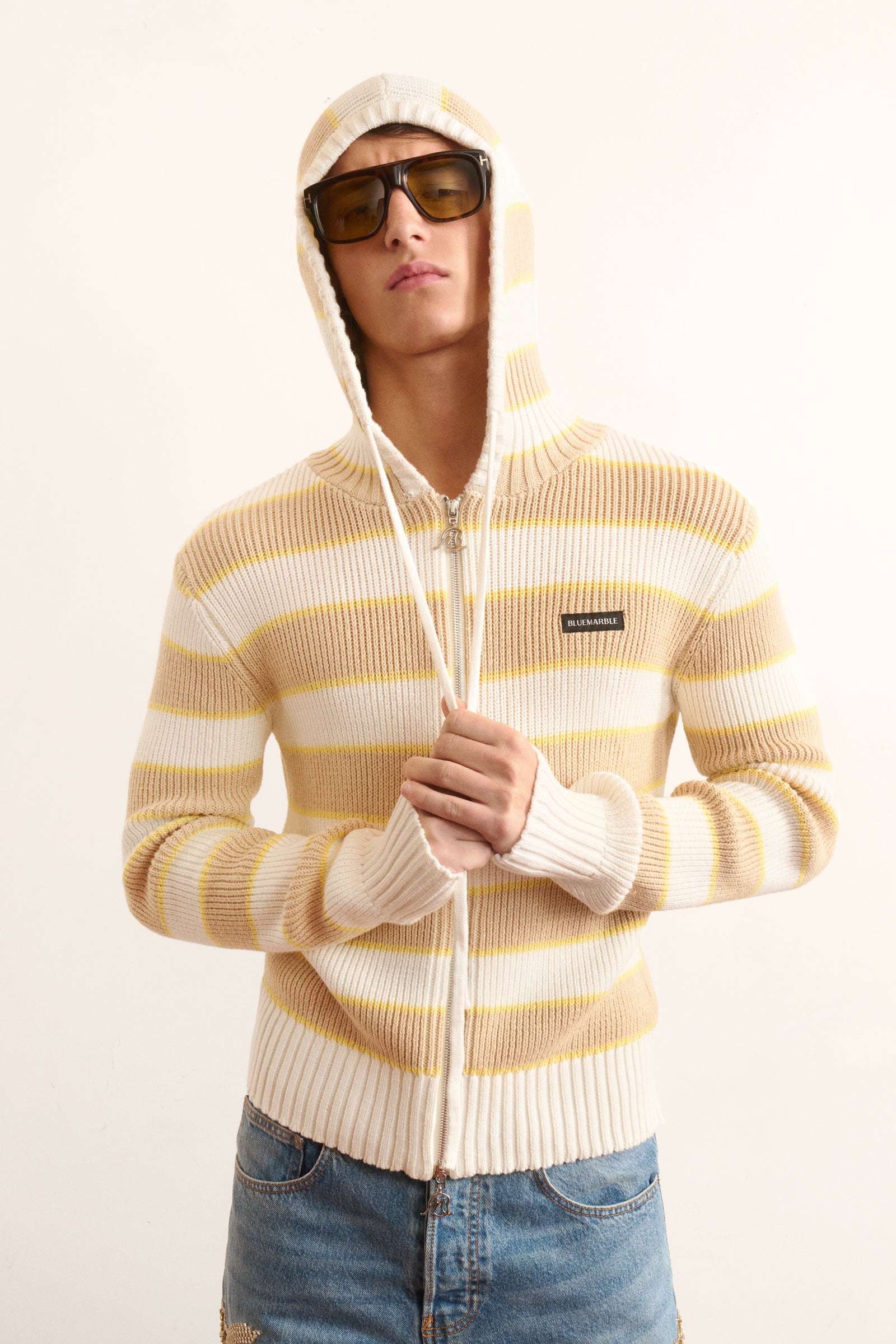 Striped Zip-Up Hoodie Fitted cotton-yarn hoodie, front zip with Bluemarble signature puller in soft ribbed knit and drawstring in the hood. Striped pattern in three colors. Elongated sleeves.