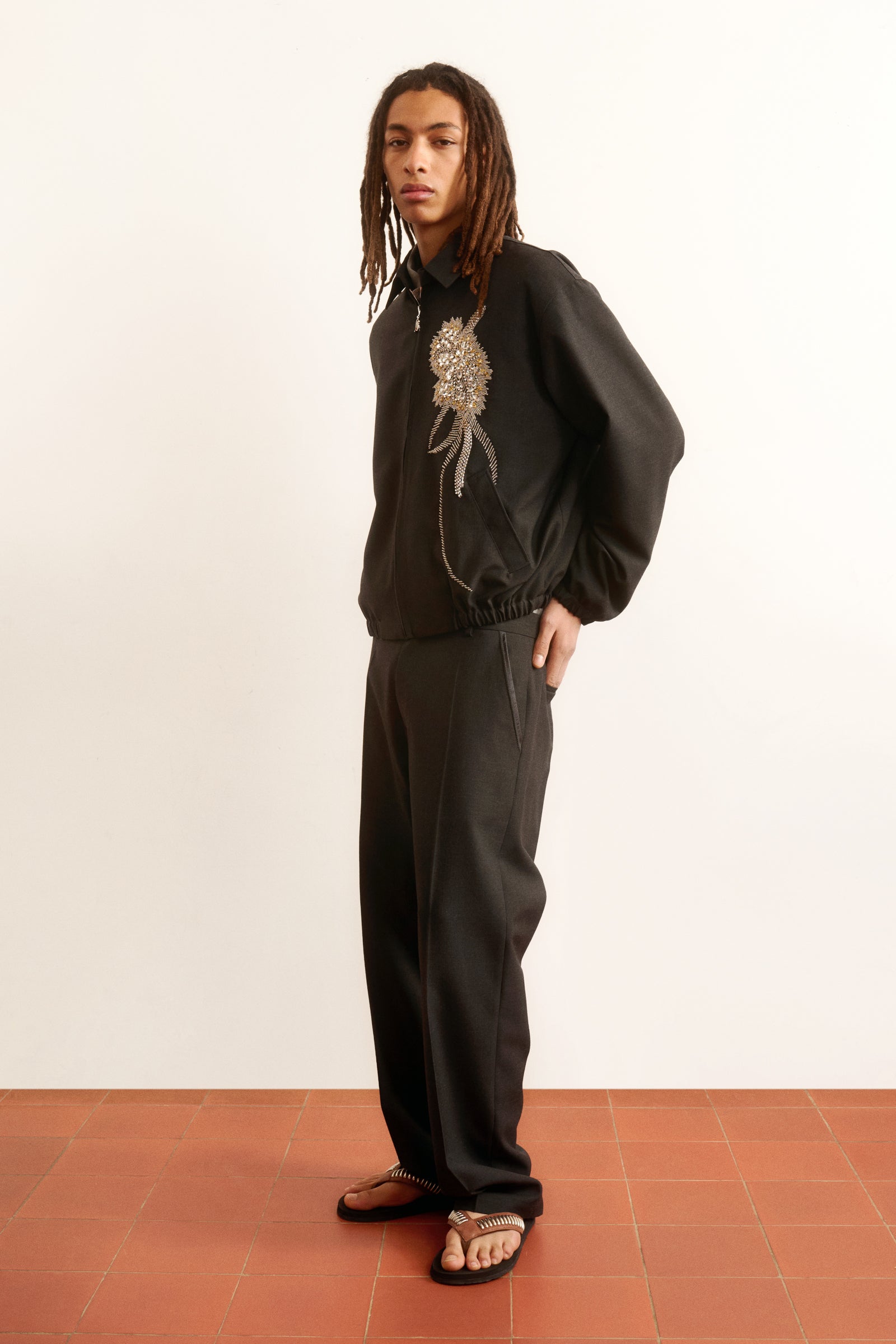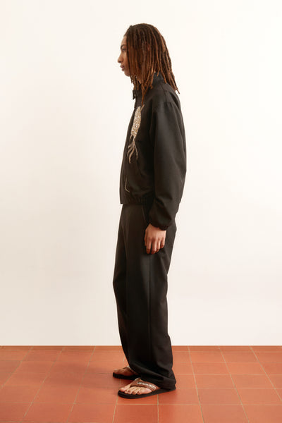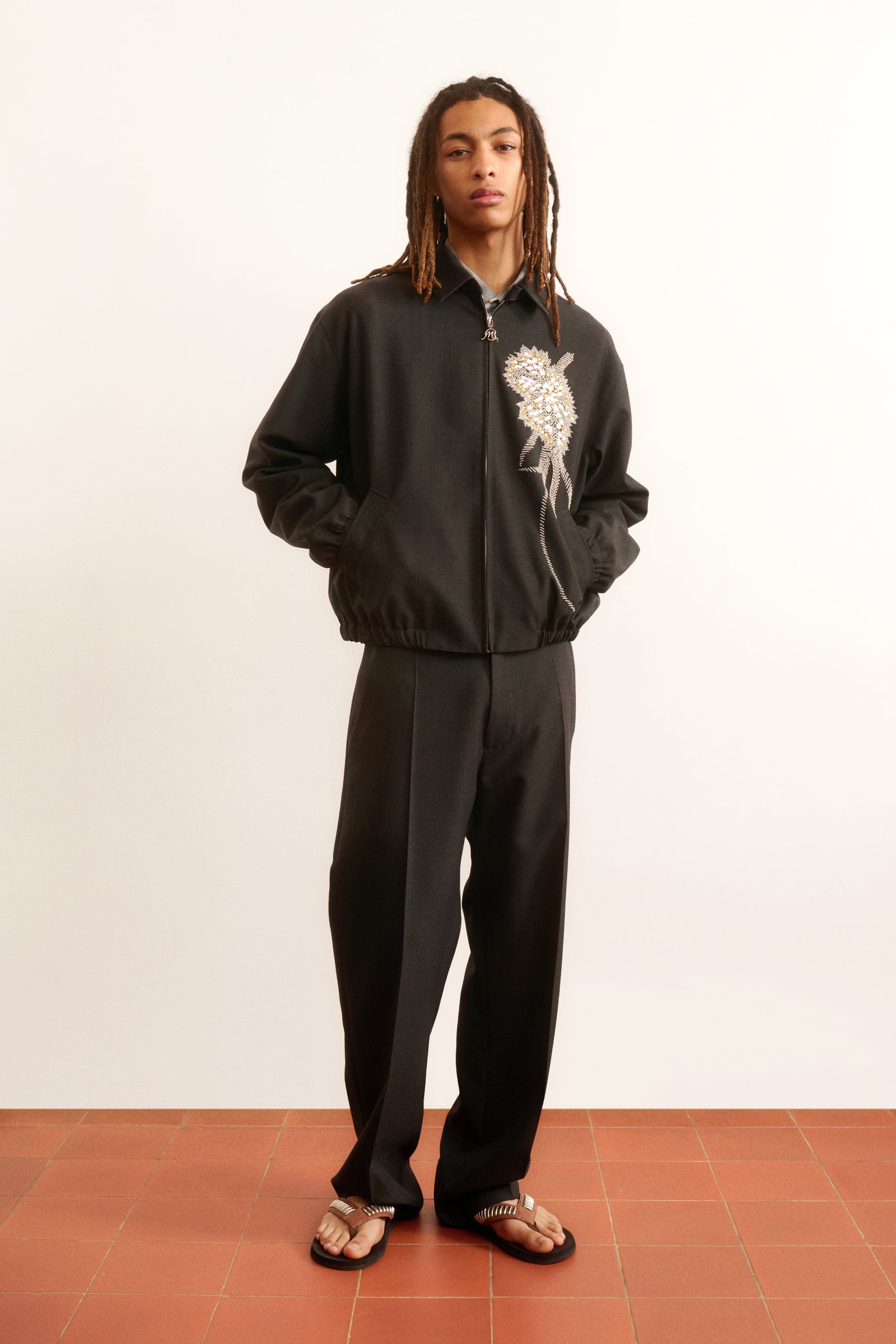 Relaxed-fit jacket with dropped shoulders and boxy silhouette. Front zip closure with Bluemarble signature puller, elasticated cuffs and hem, side welt pockets. Fully lined. Hand-embroidered with Bluemarble’s signature beaded and rhinestone flower embellishment.
