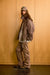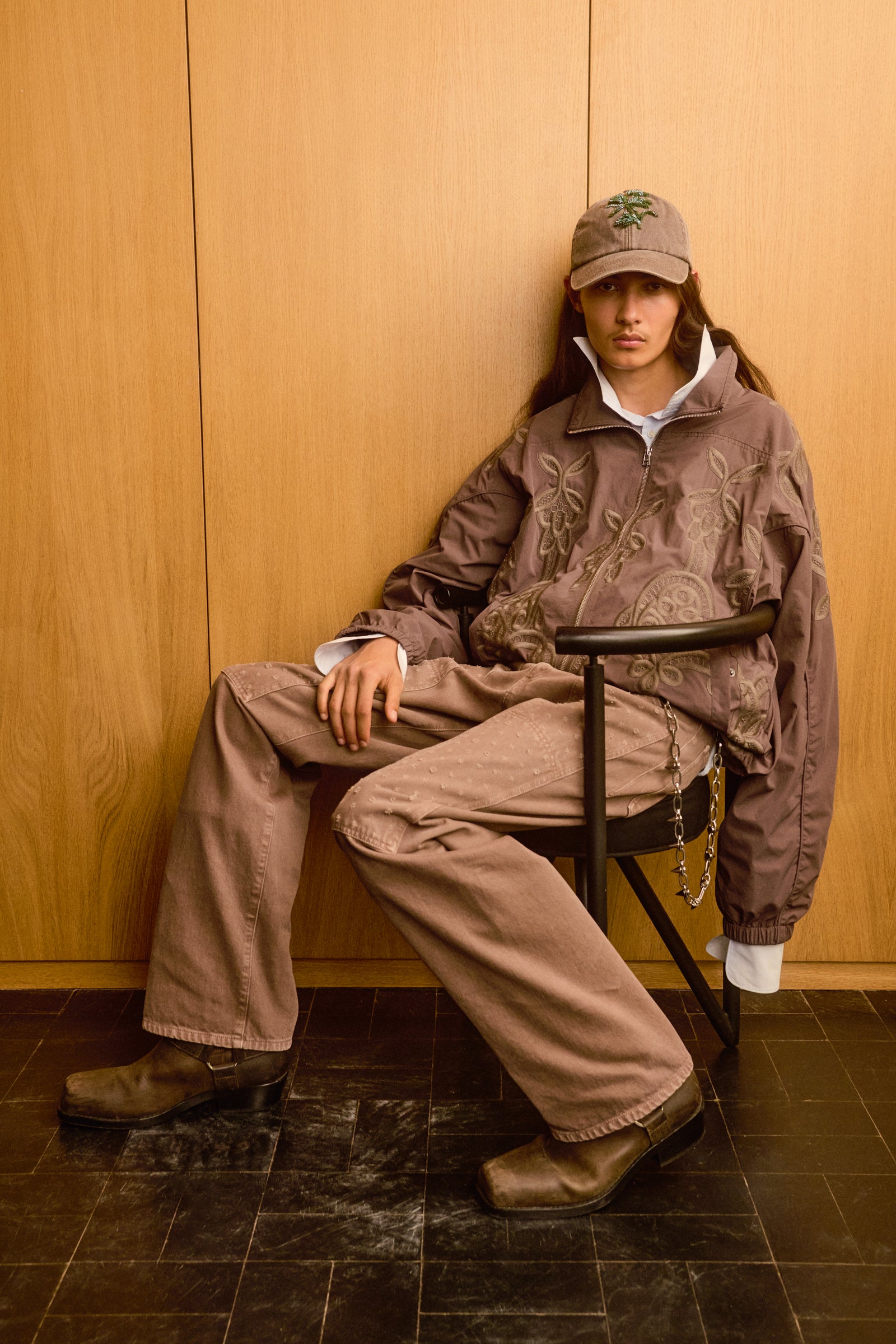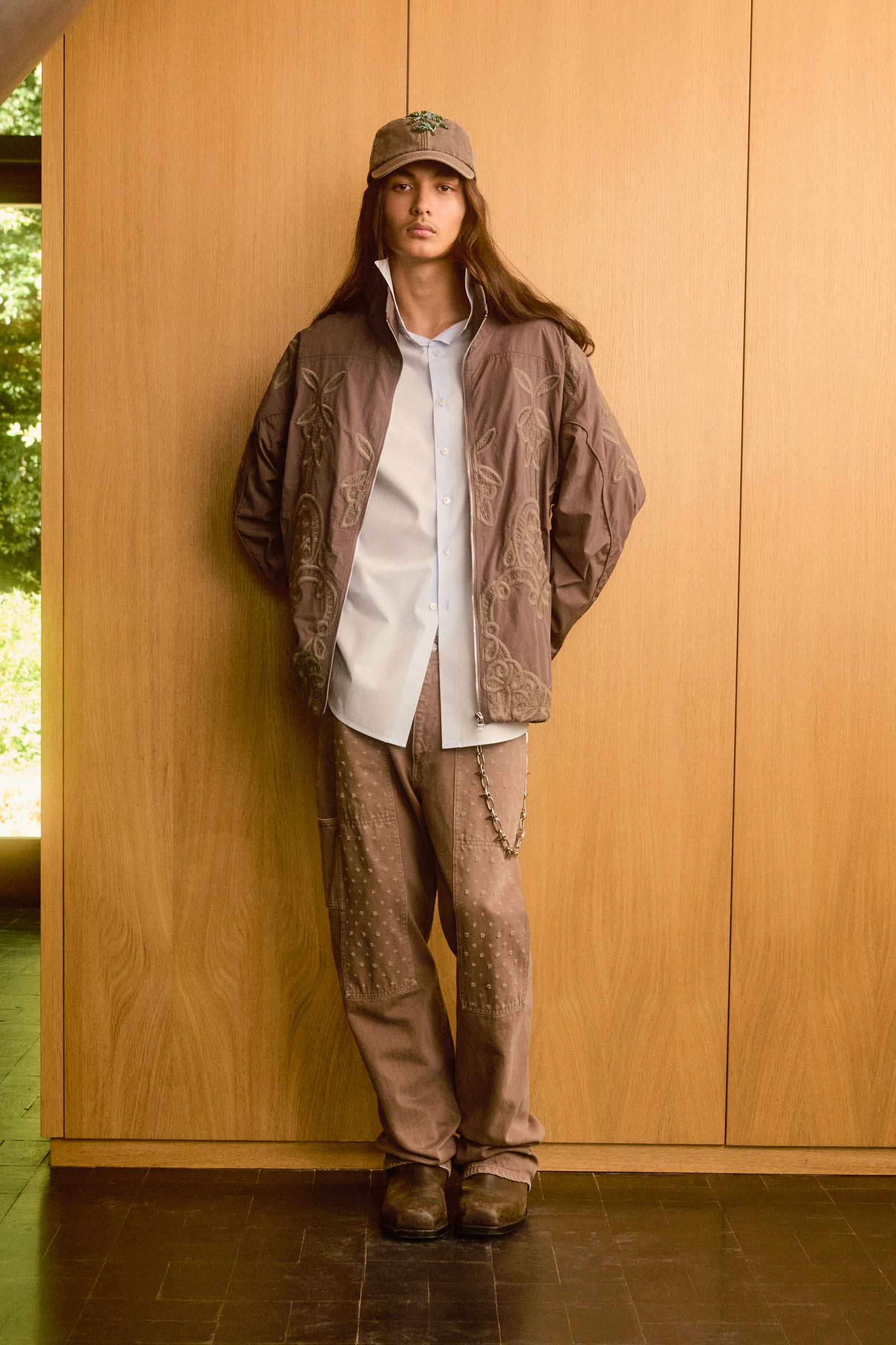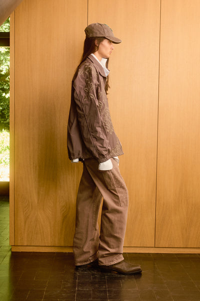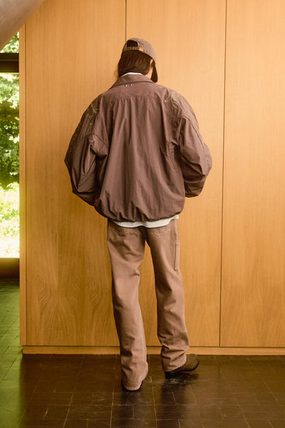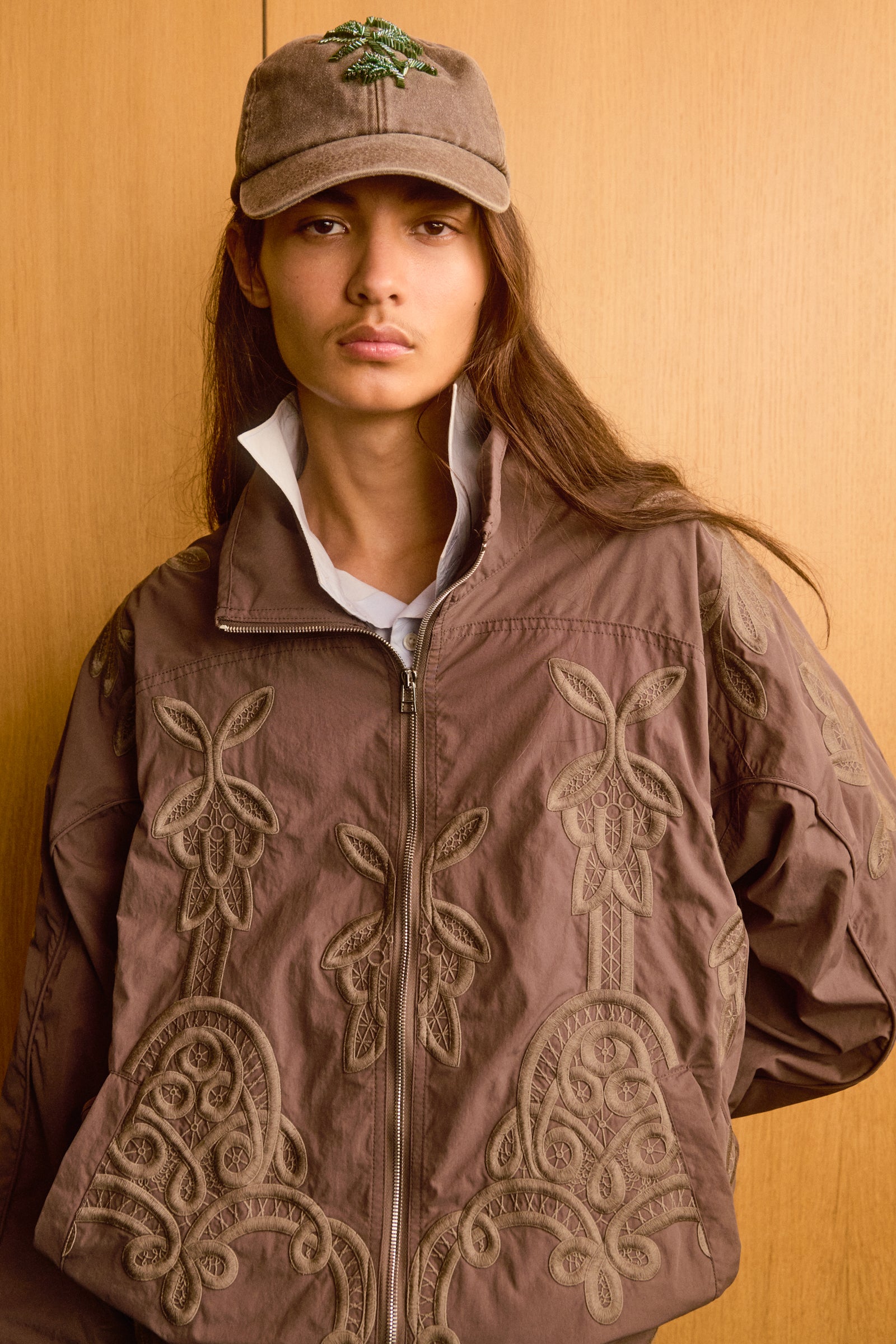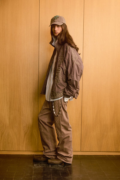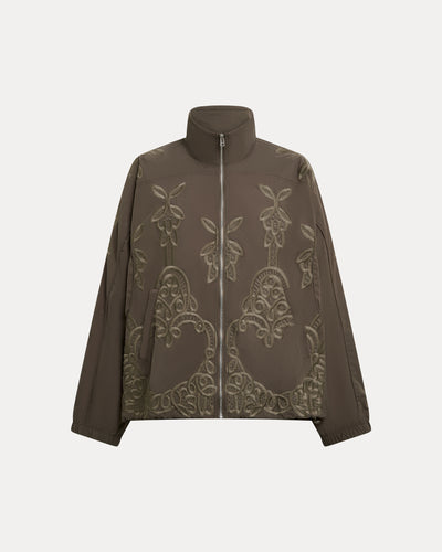 Boxy-fit nylon track jacket in khaki with tone-on-tone piping, high collar, and snap buttons on welt pockets. Fully embroidered with rivet studs at the back of the neck. Features a drawstring hem.
