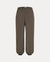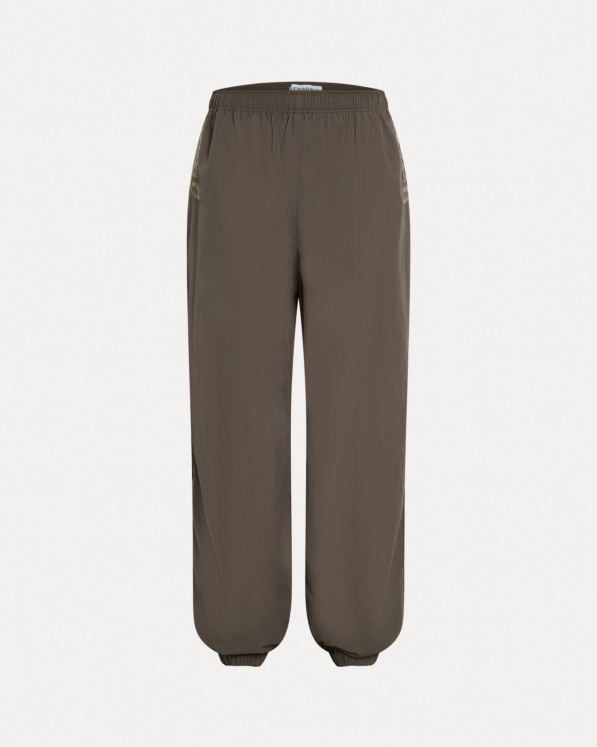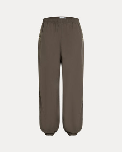 Wide-fit grey khaki nylon trackpants with a slight sheen, elasticized hems, and tone-on-tone piping on the sides. Features zipped pockets with lace-like embroidery, an elastic waistband, and a drawstring. Mesh stretch lining.