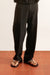 Tailored pants in black with a straight wide leg, clean waistband, concealed zip closure, side pockets, and a structured full-length silhouette.